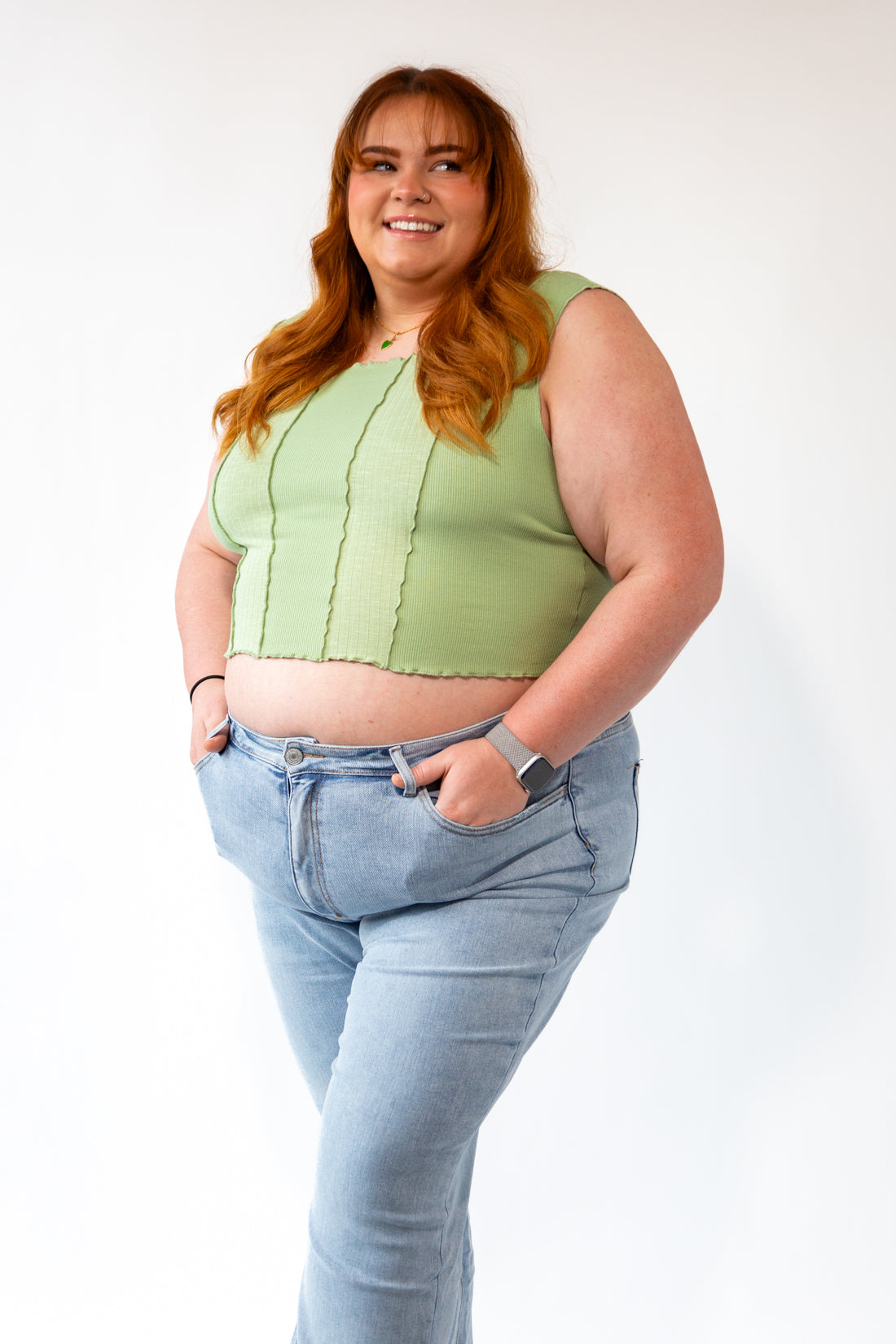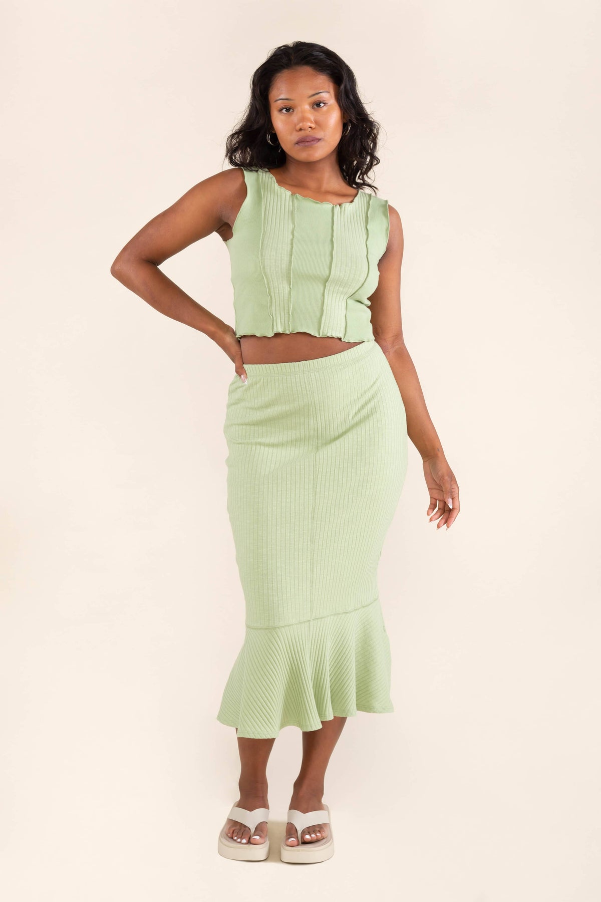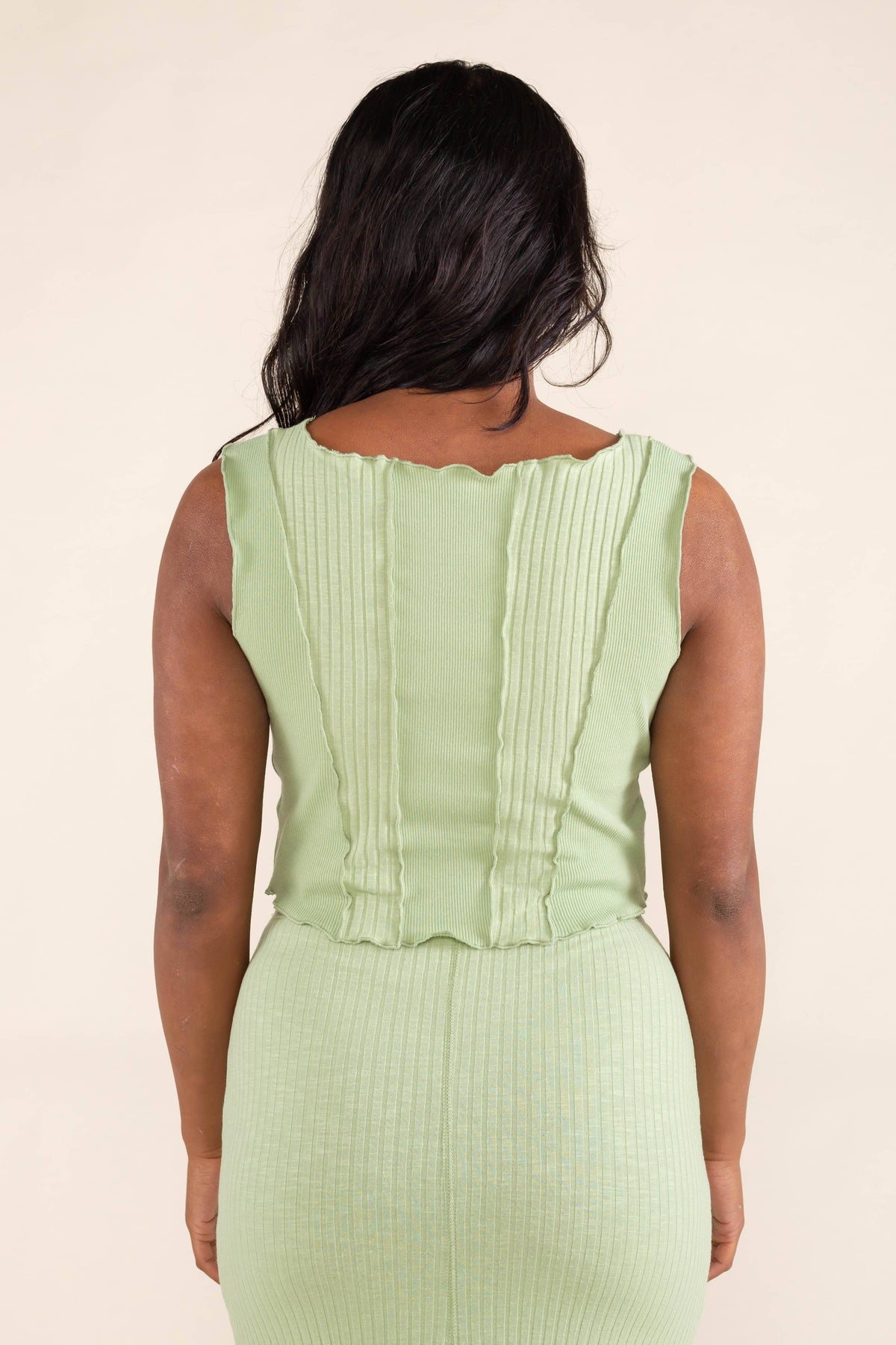 La Brea Ribbed Tank by NLT is a playful addition to your wardrobe, featuring a gorgeous matcha green hue and charming detailing. Mixed ribbed detailing gives a modern patchwork design.