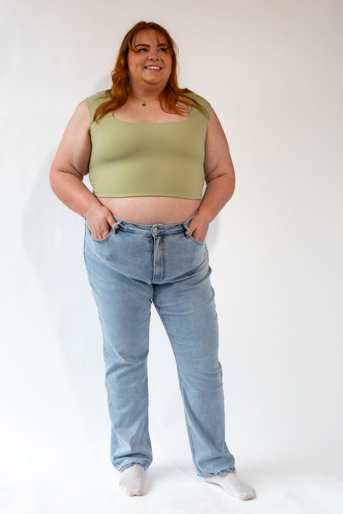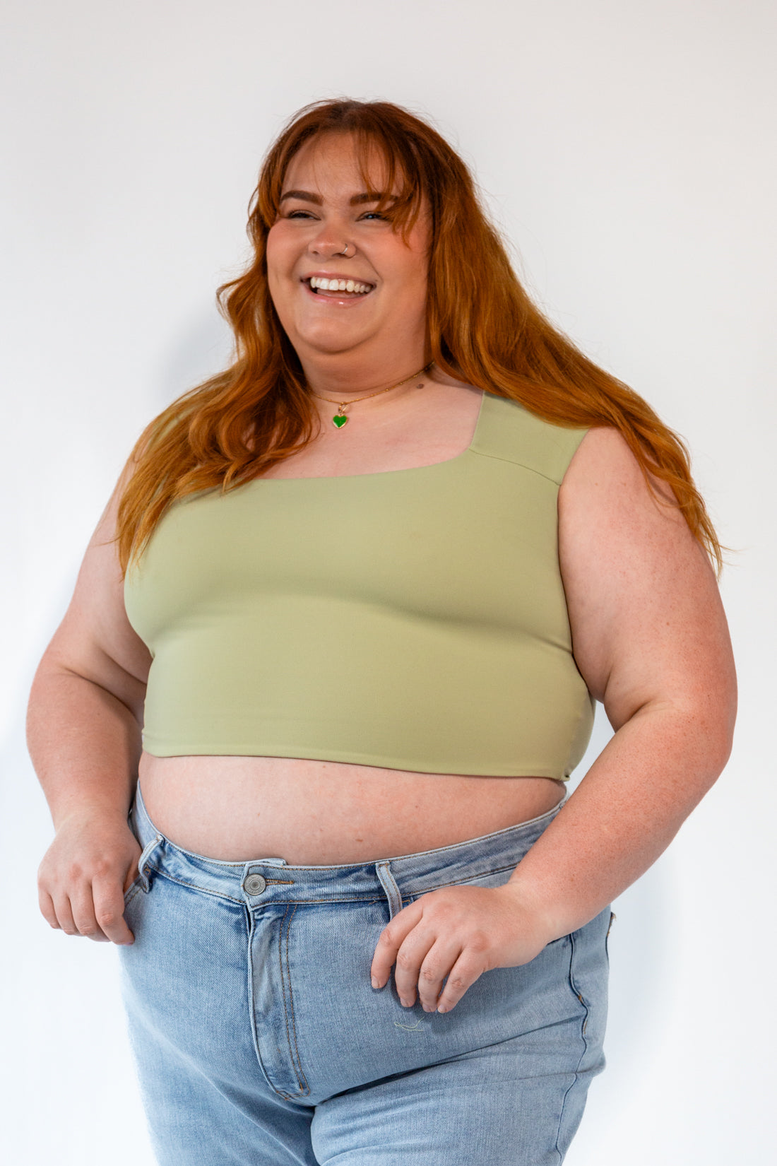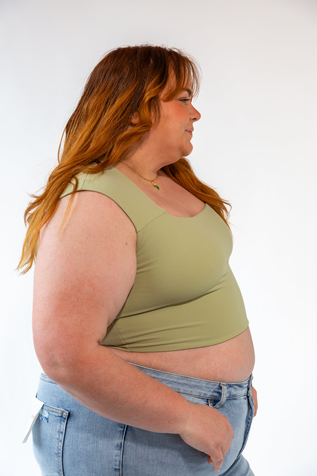A super cute crop top with a flattering square neckline. It's double layered for added support and a non-see through design (aka no peek-a-boos!). The fabric has a compressive feel and is double brushed (aka crazy soft) for a super flattering fit.