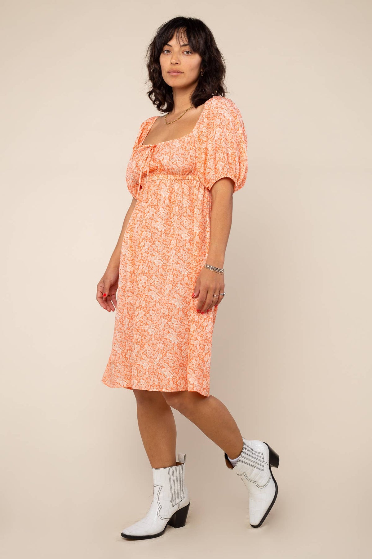 Add some tropical flair to your summer wardrobe with this stunning flower print dress. Wear it as a cold shoulder or with a light puff sleeve and spaghetti tie at the bust. Made from a lightweight and comfortable material, it fits true to size.