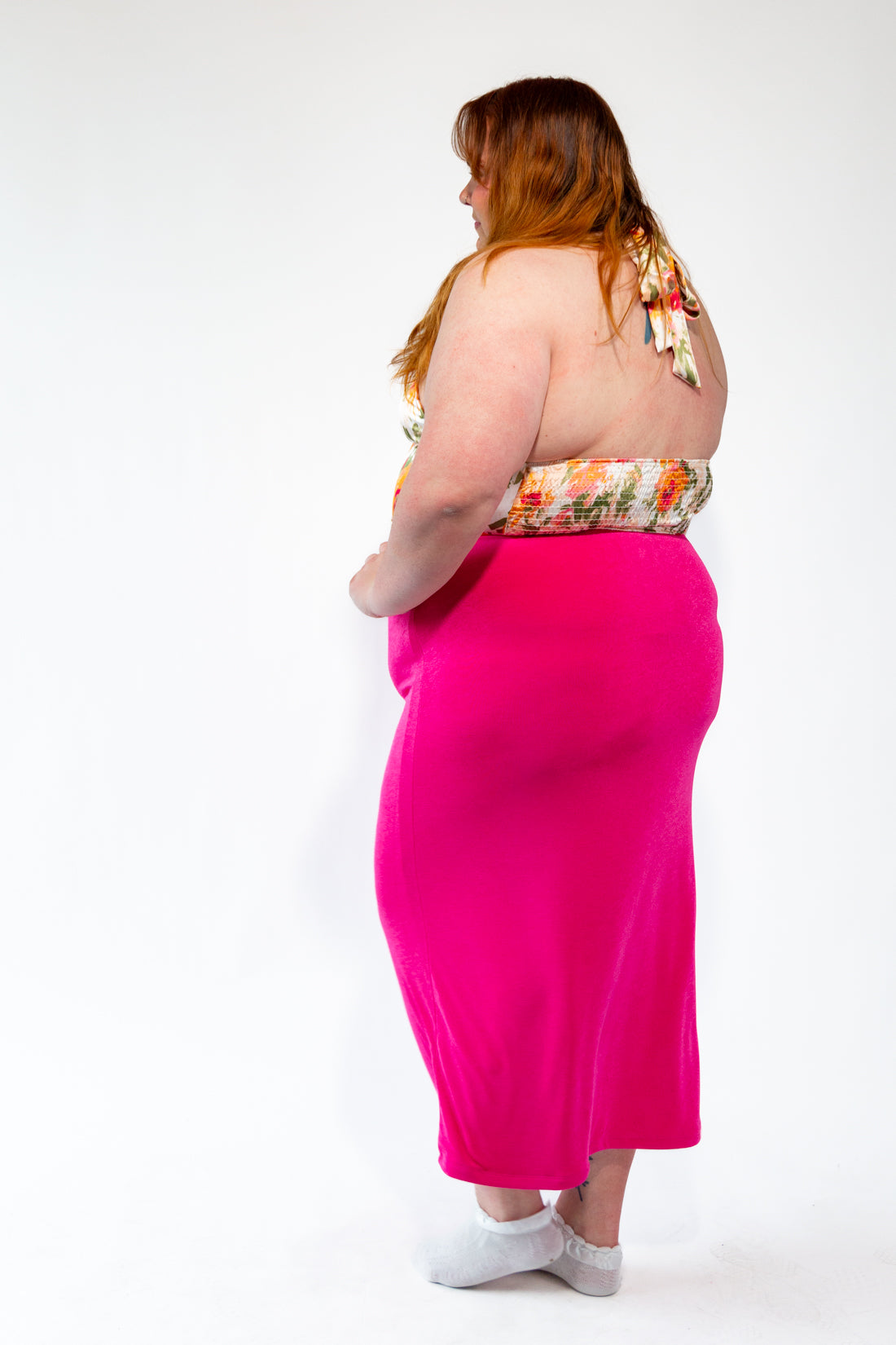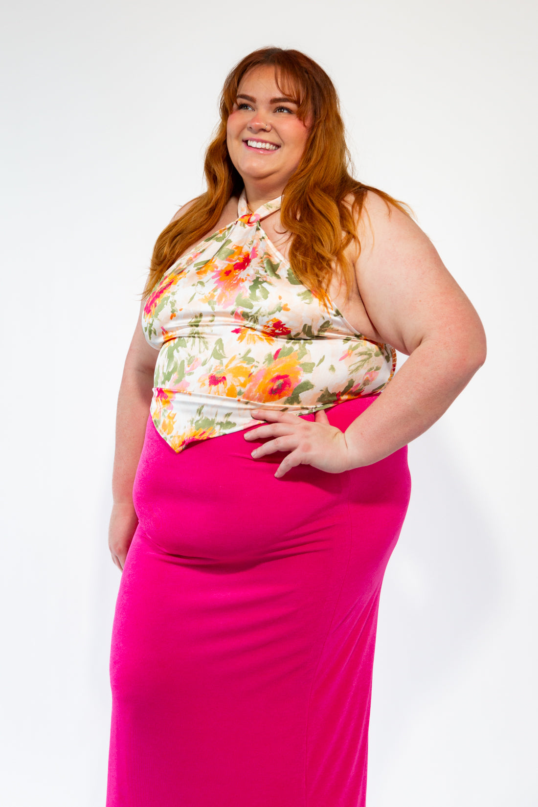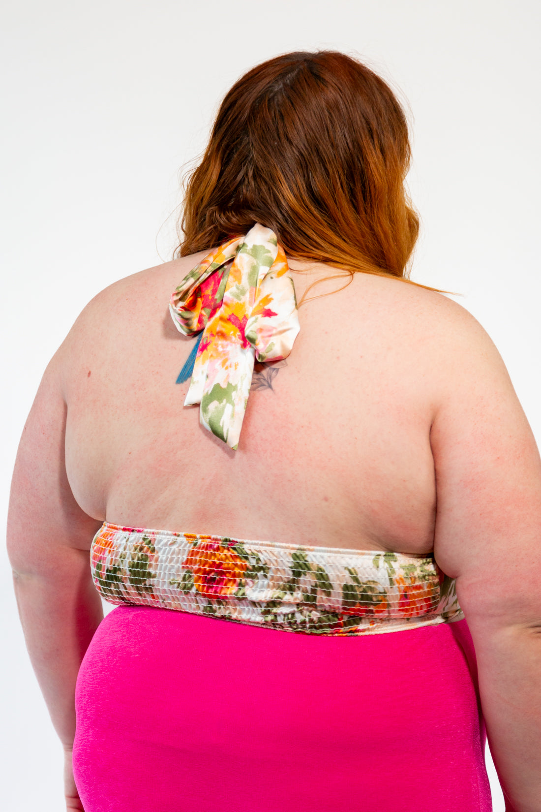 Satin print handkerchief halter blouse with shirring in back. This Bandana style blouse features a beautifully colored floral print. Extra long neck tie allows for different tying styles in the back. This does run snug for bigger chested people, so please double check your size. It also runs snug around apron belly waists.