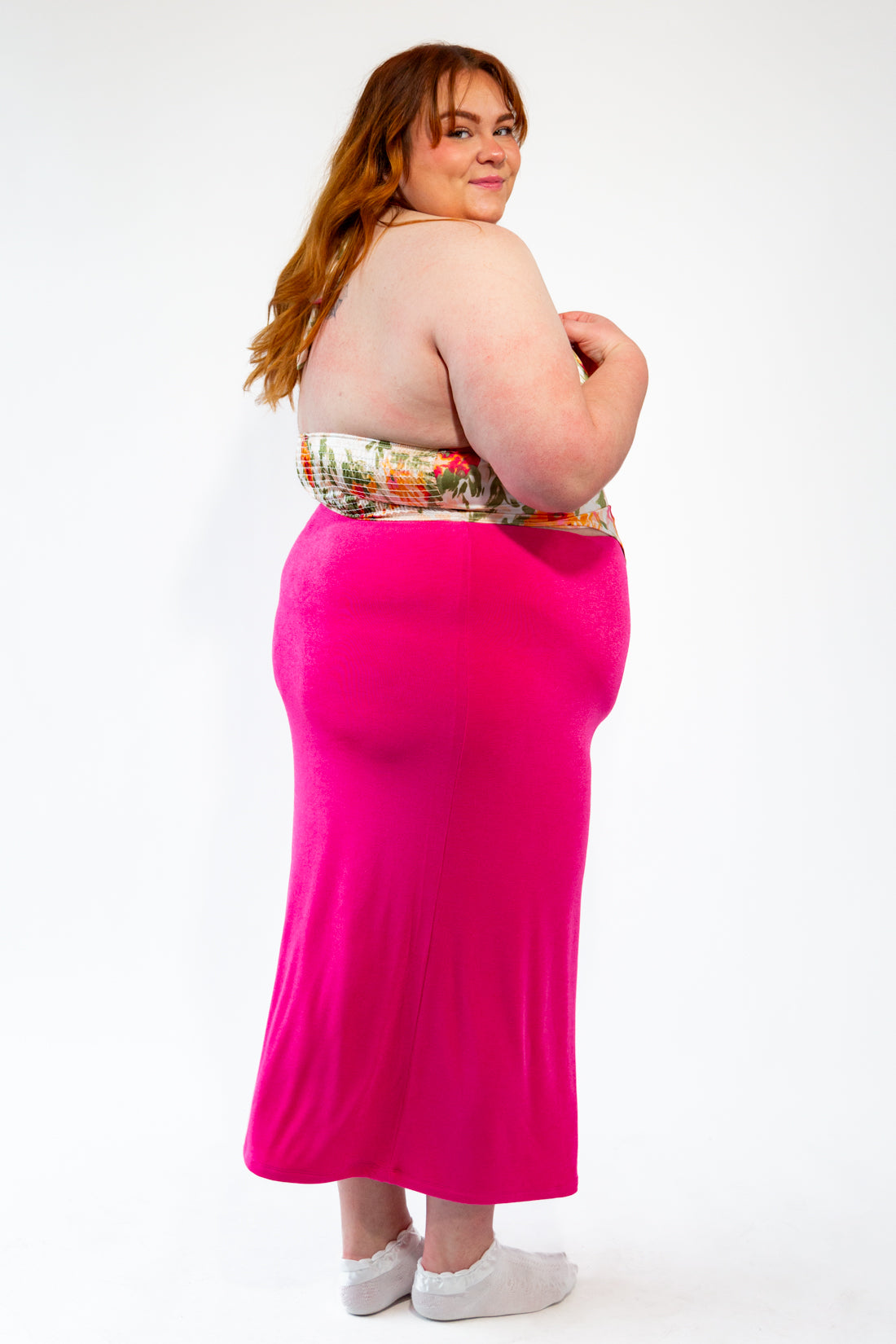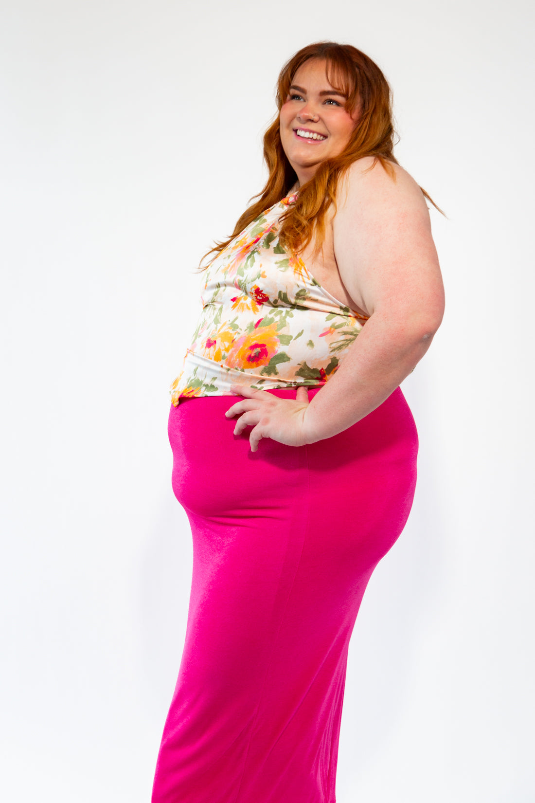 Shelby is 5'10, normally wears a size 3XL and 18. She is wearing a 3XL in this top. It fits a little snug around her waist.