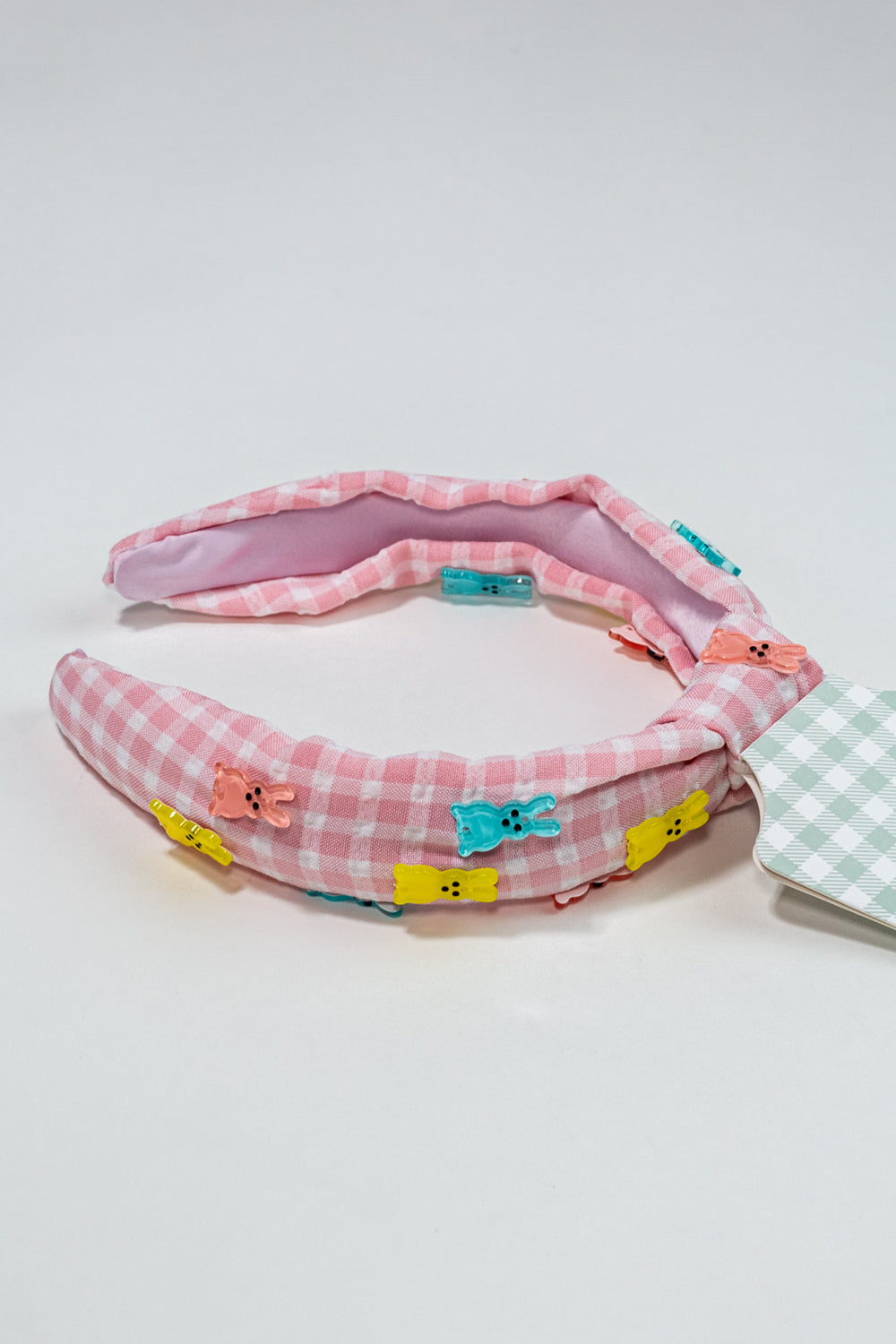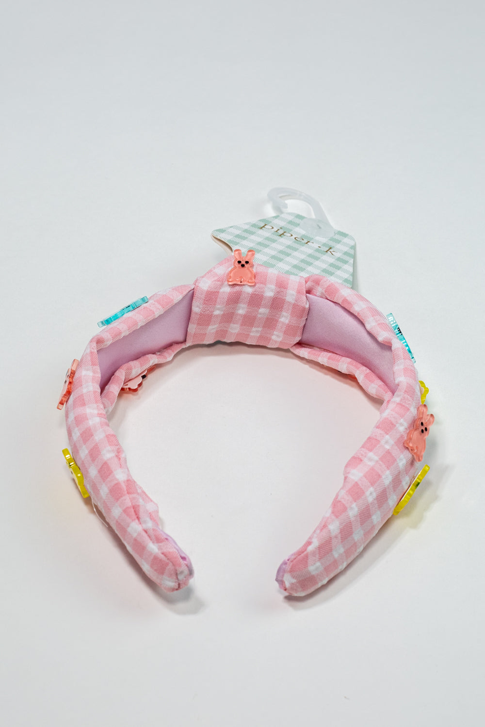 This cute spring headband features pink and white gingham style fabric with a top knot. with plastic pastel bunny details all over. Made from cotton and polyester.
