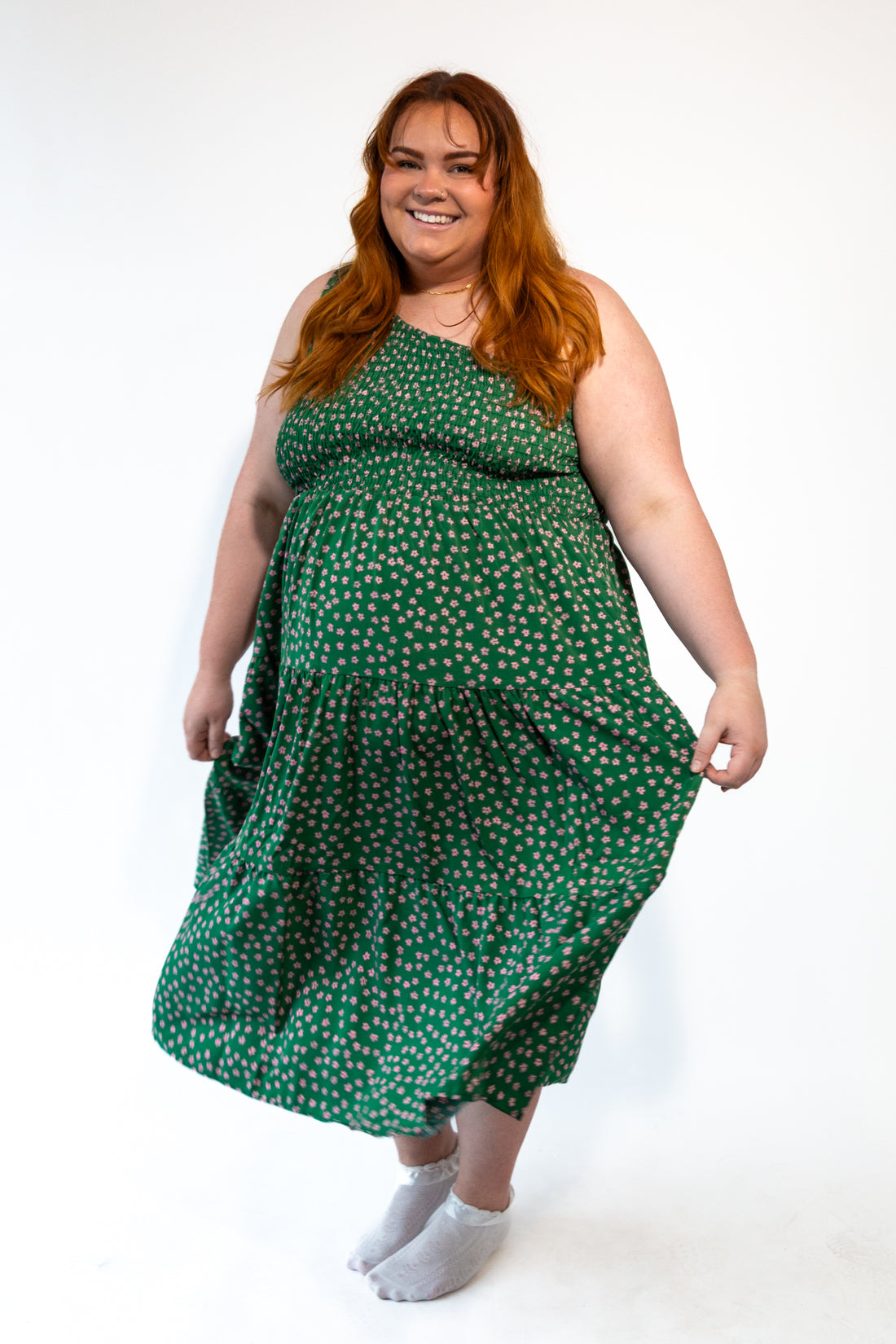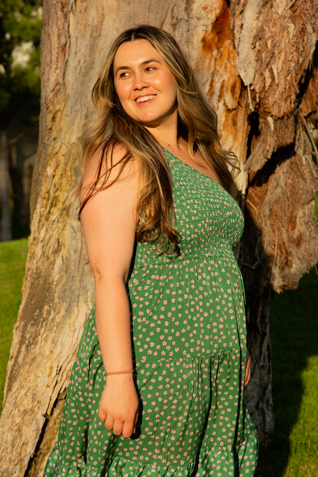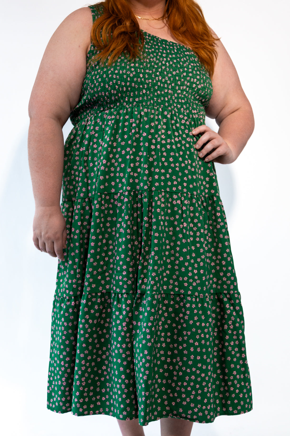 This Topanga Green One-Shoulder Dress by NLT is our boutique top pick. It's flattering on all shapes and sizes with its one shoulder design, tiered midi length, and smocked bodice. This fabric is a ditsy print, wool peach woven and made 100% in Los Angeles, CA.