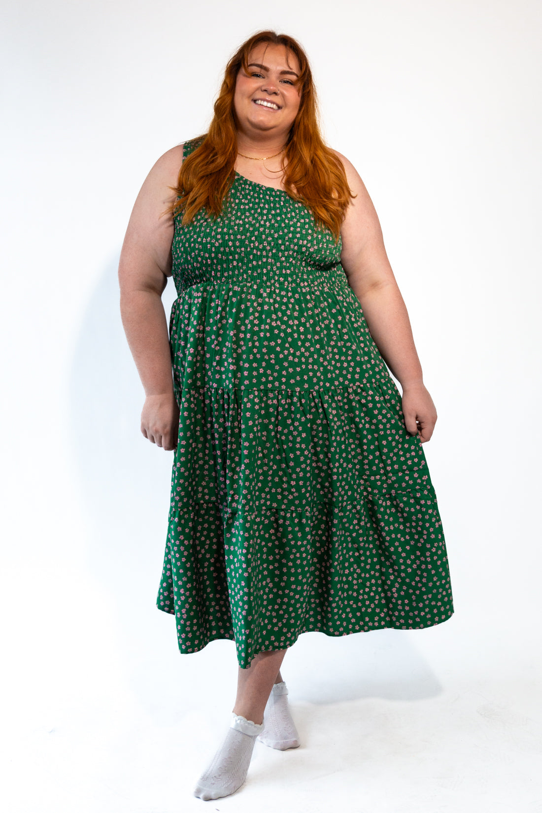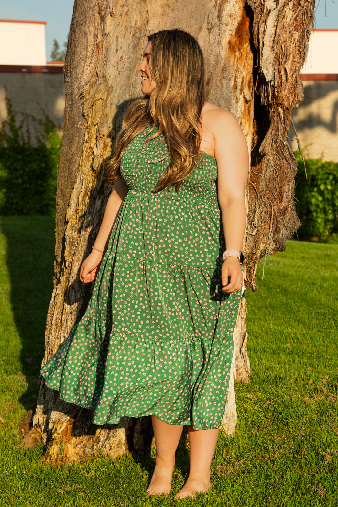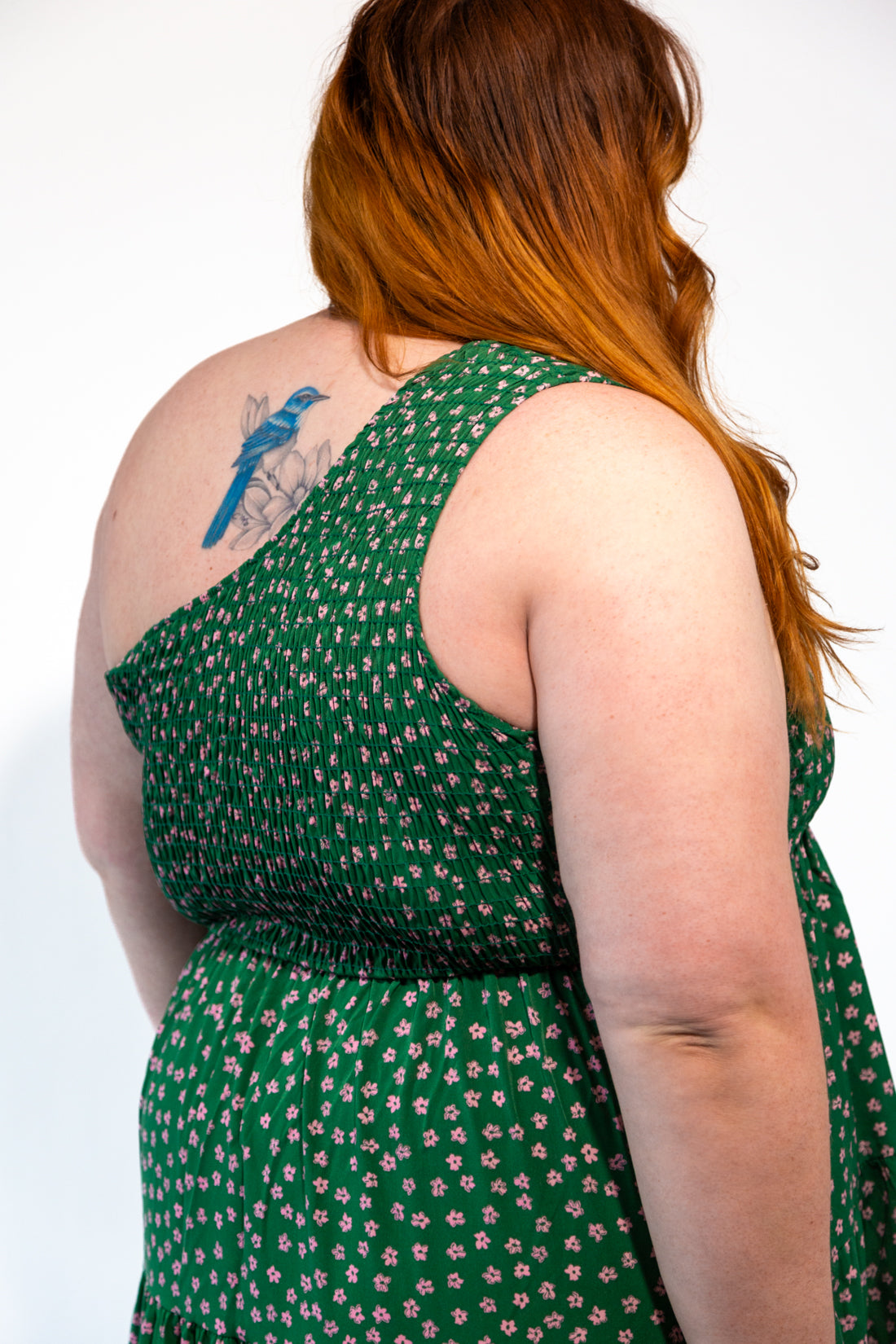 This Topanga Green One-Shoulder Dress by NLT is our boutique top pick. It's flattering on all shapes and sizes with its one shoulder design, tiered midi length, and smocked bodice. This fabric is a ditsy print, wool peach woven and made 100% in Los Angeles, CA.