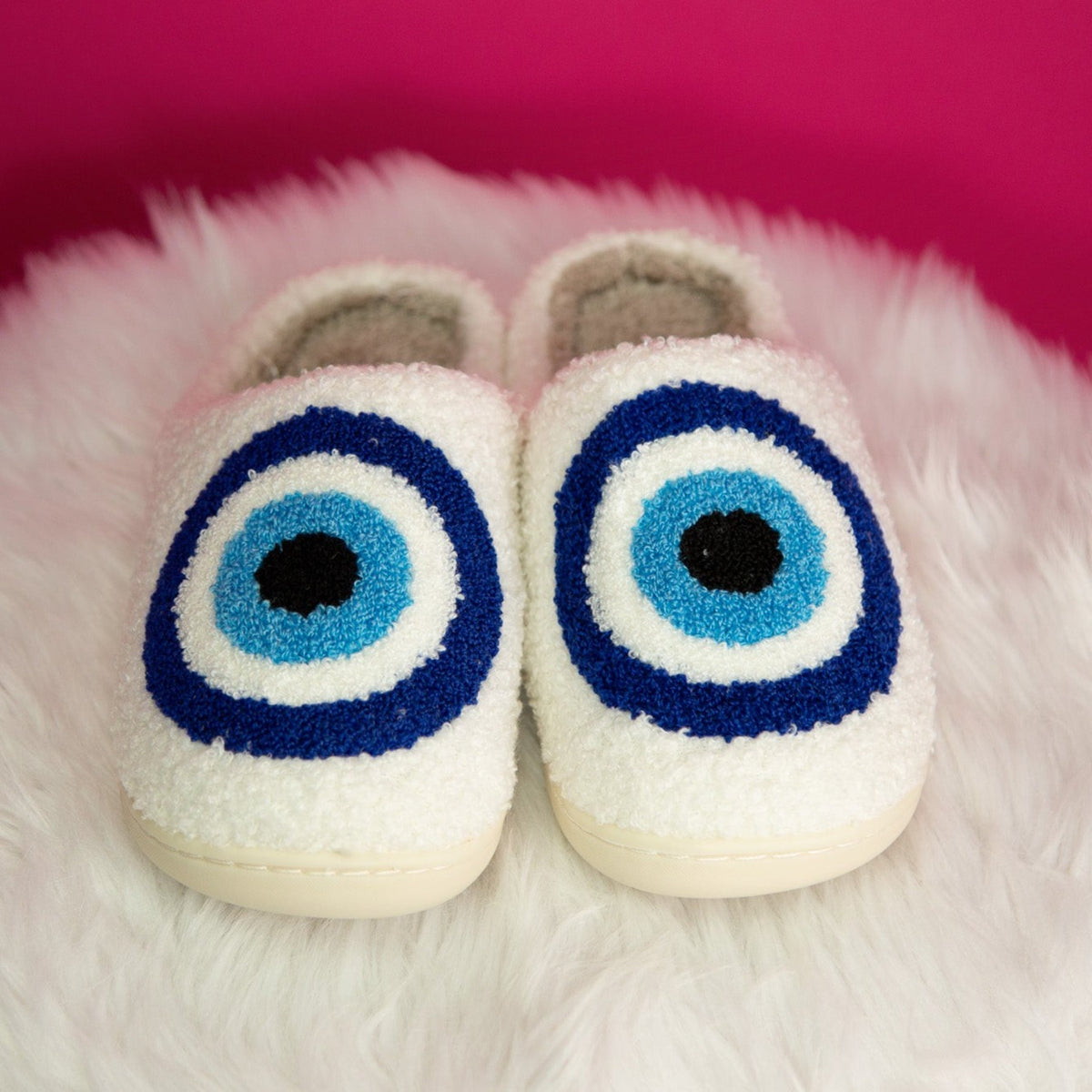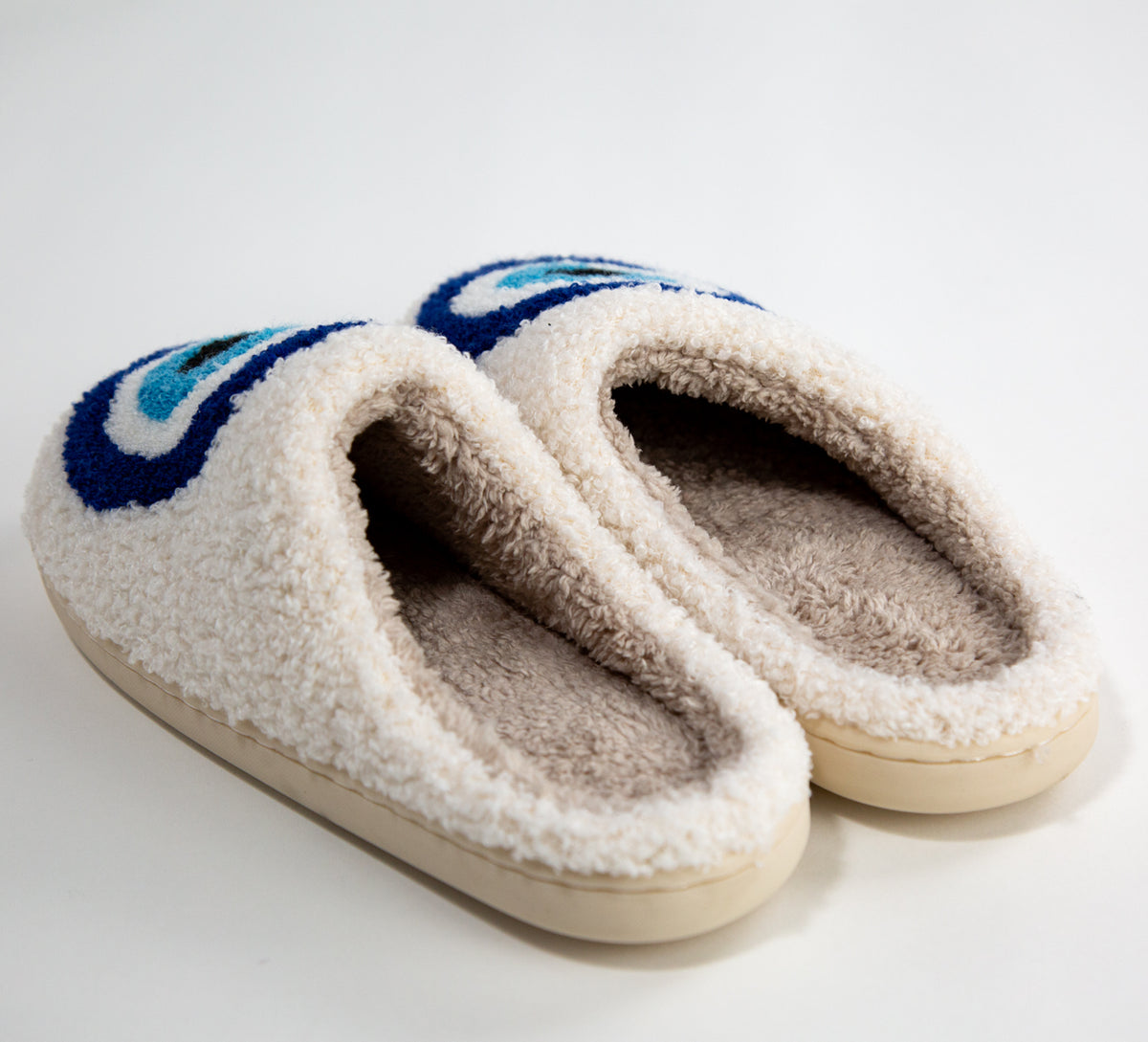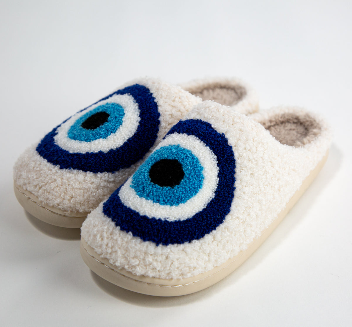 No bad vibes here. Our Evil Eye Fuzzy Slippers are ideal for lazing around the house featuring a soft and cozy feel, perfect for keeping your feet warm and relaxed. With a rubber outer sole and an evil eye design, they are comfortable, practical and eye-catching. Now you can stay stylish and comfortable throughout the whole day.