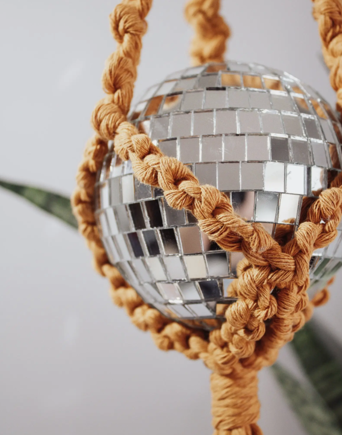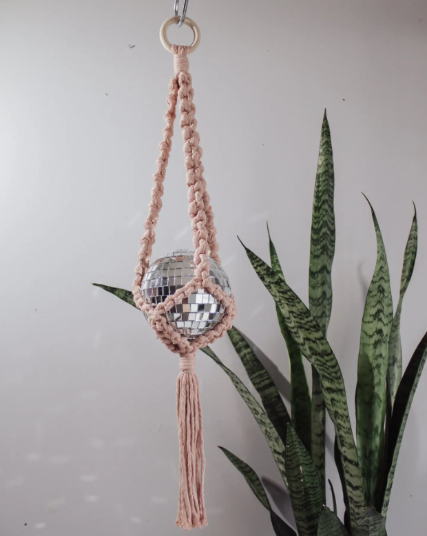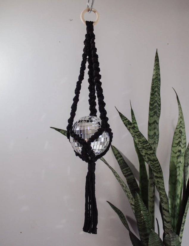 Make your home sparkle with these macrame disco ball hangers! Hang by a sunny window from the ceiling, wall, or right on your curtain rod and watch the magic happen. This groovy babe is made with a wooden ring, 4 inch disco ball and 100% zero waste, recycled cotton cord.