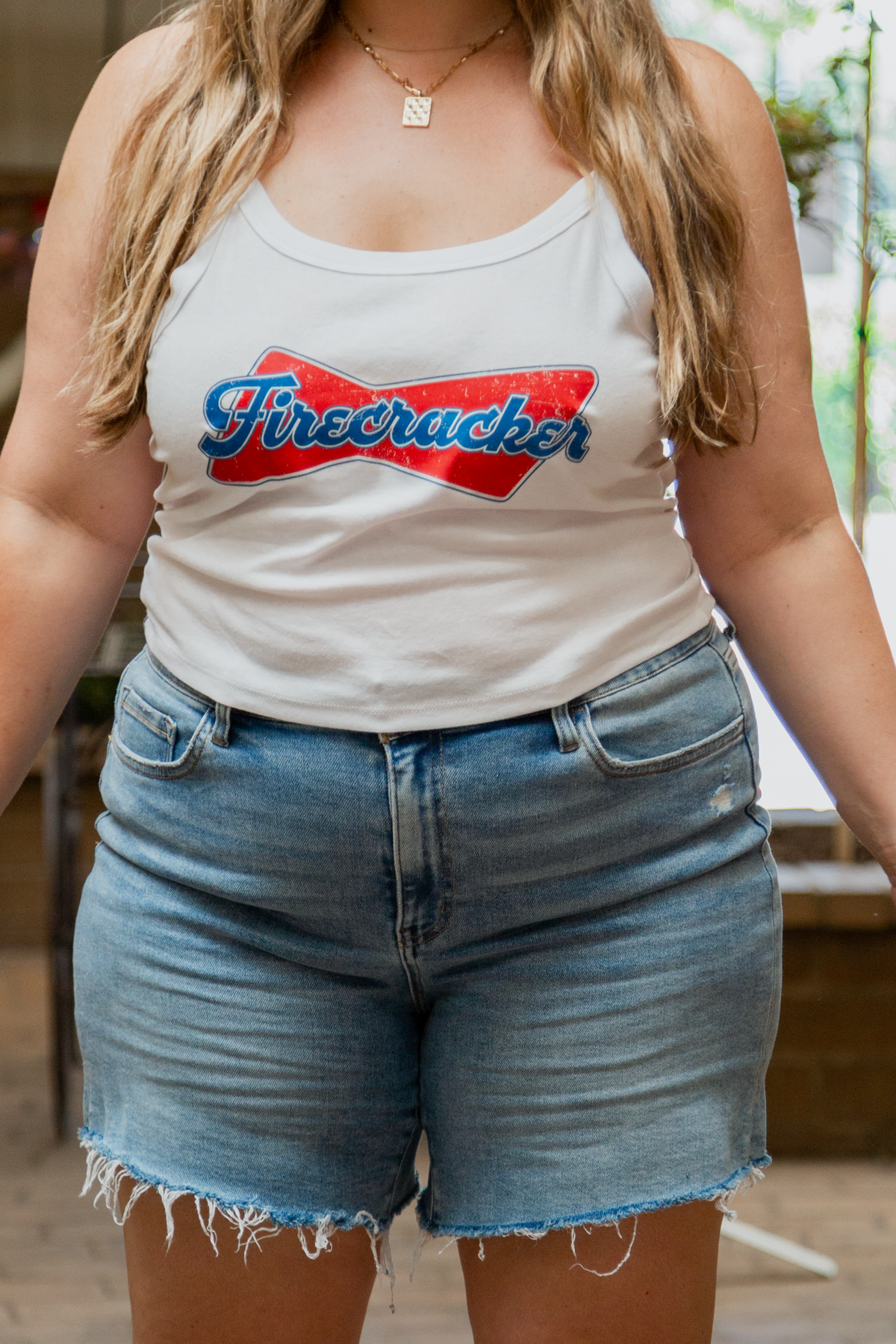 Firecracker patriotic fitted stretch spaghetti crop tee. This cropped tank is pre-shrunk and features a muted cobalt blue design that hits well above the belly button. The perfect crop for Fourth of July activities or just because. All of our graphic tees are made to order, so please allow up to 1 week for production.