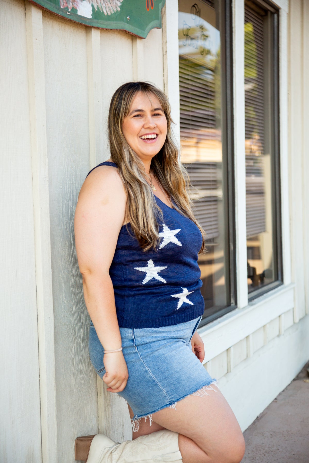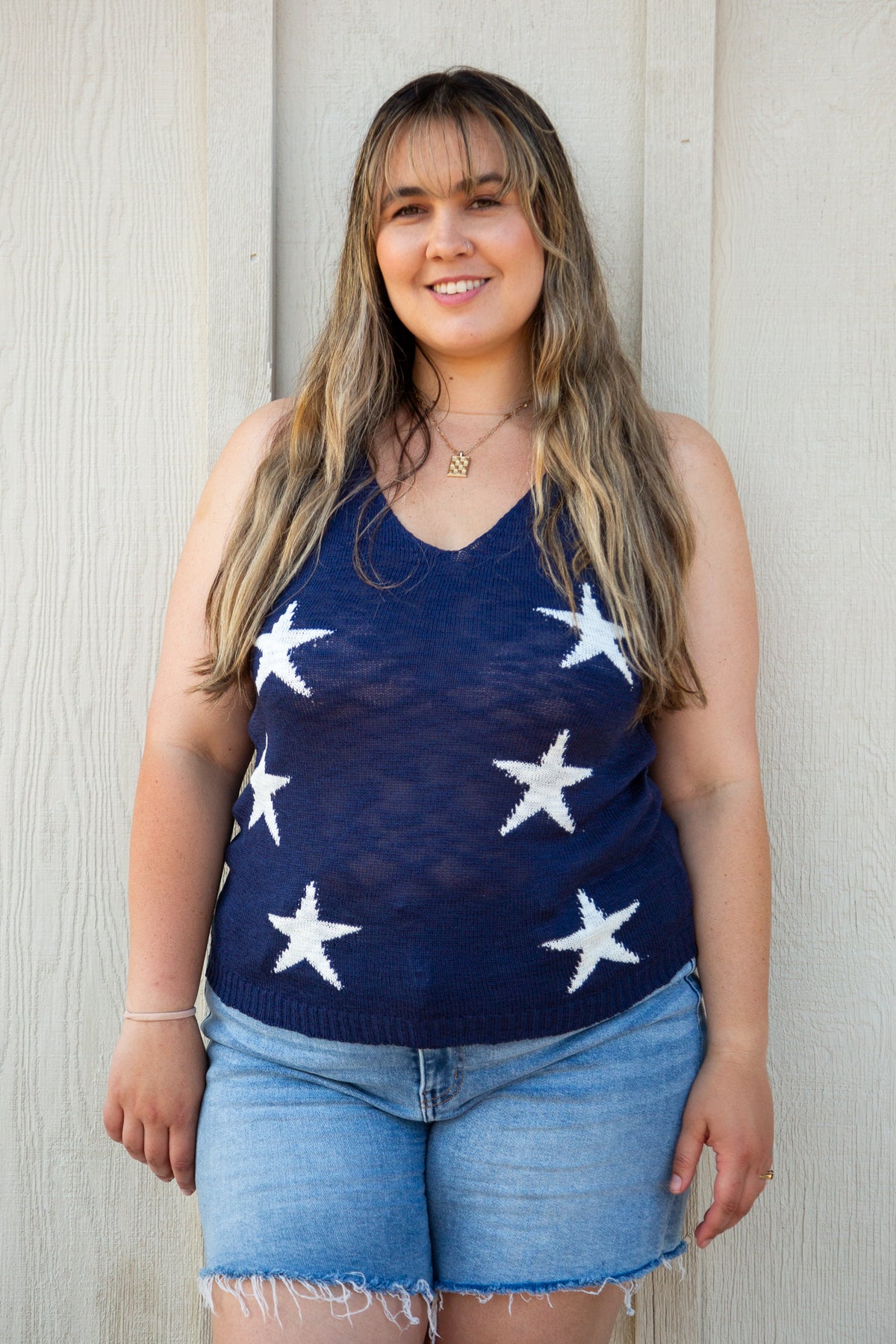 Stay cool and patriotic this summer with the Star Struck Knit Tank. This light weight navy blue sweater tank top featuring white stars. With a comfortable stretch this top is comfortable and breathable with the beautiful knit design. It's slightly sheer in different lighting. This top is perfect for summer and can easily transition to fall fits.