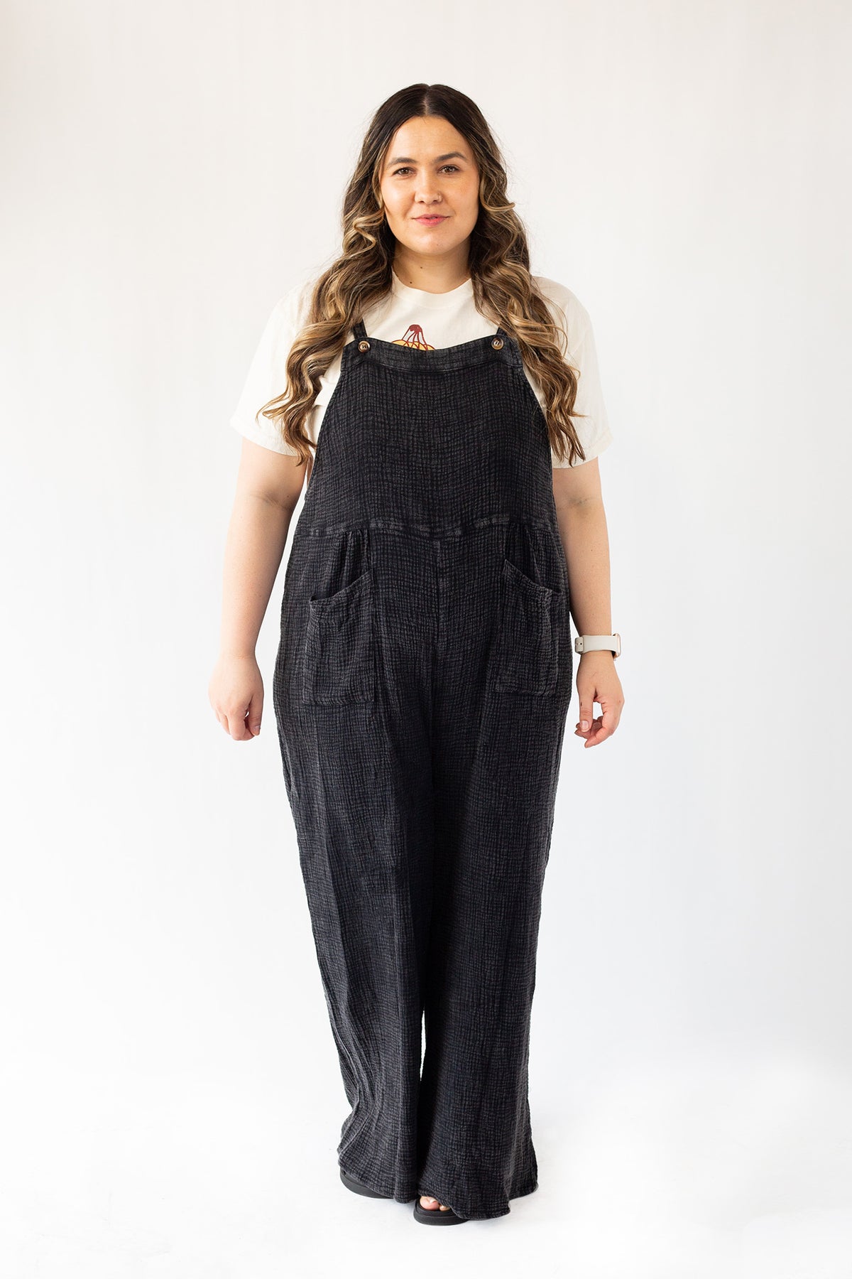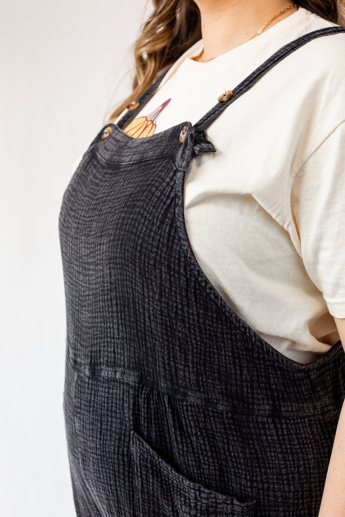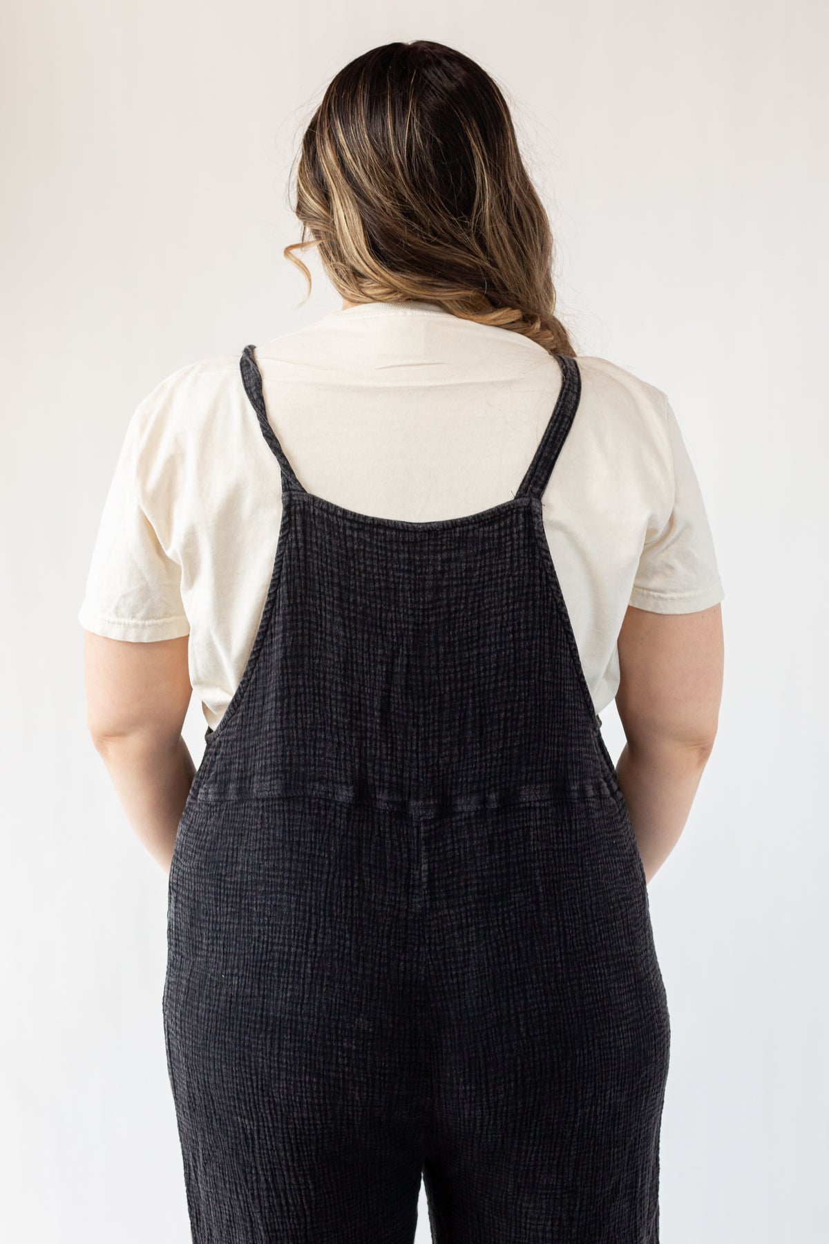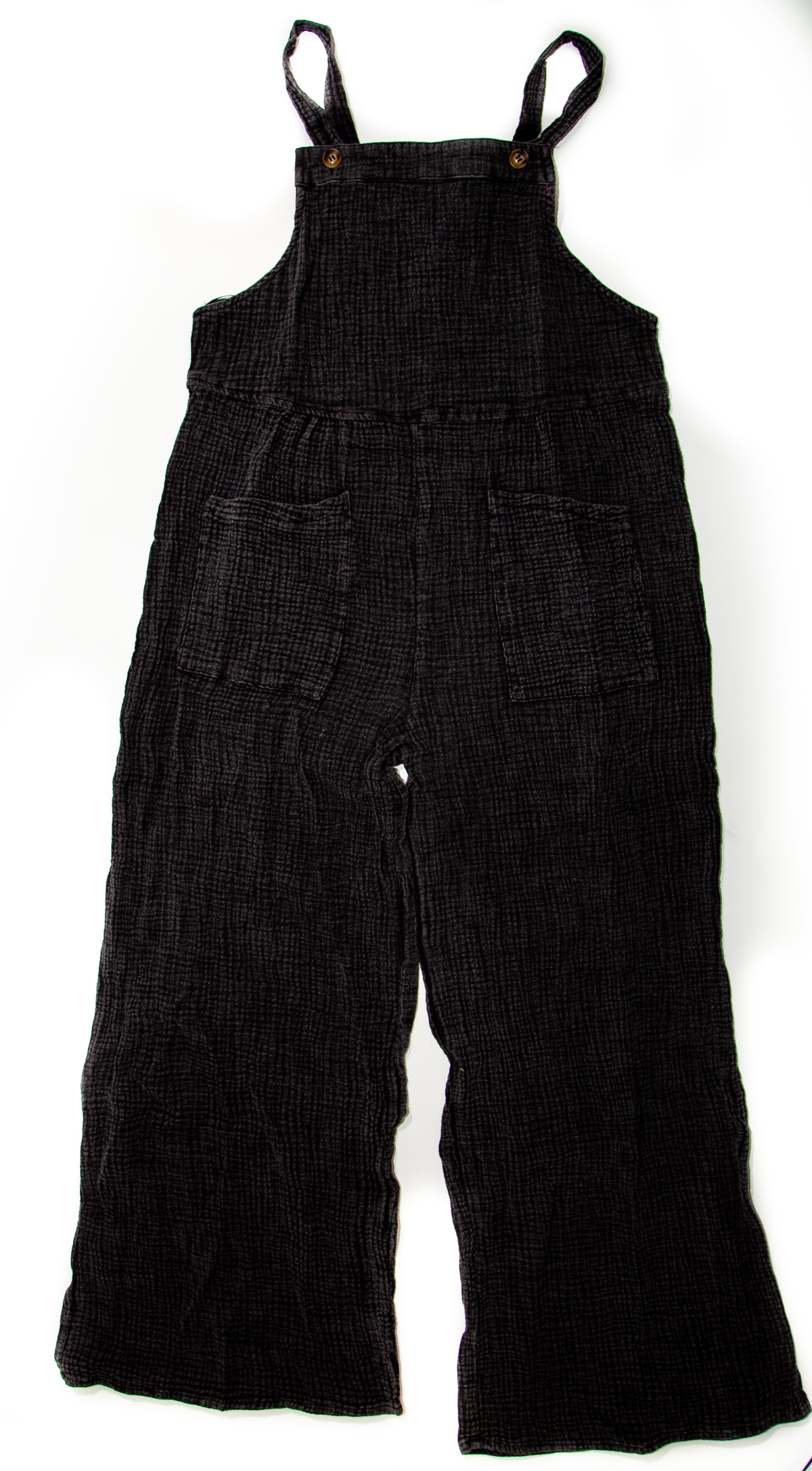 The new everyday overalls. Soft gauze material will have you wanting to never take it off. The button shoulder straps allow for versatile style and can even be breastfeeding friendly (we see you moms!). Please note that each wash style might have a slightly different wash effect and/or bleached spots. These spots are part of the washing process and it is not defective.