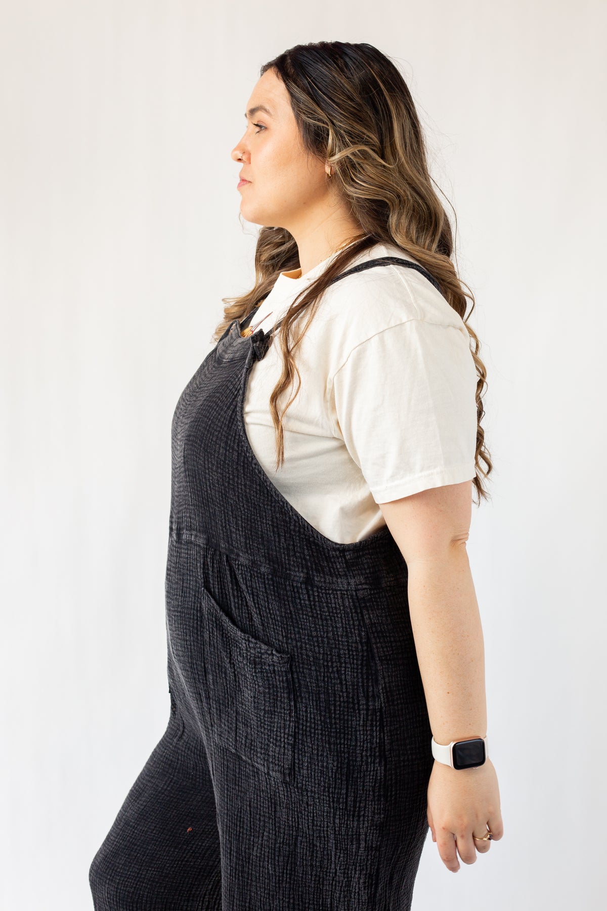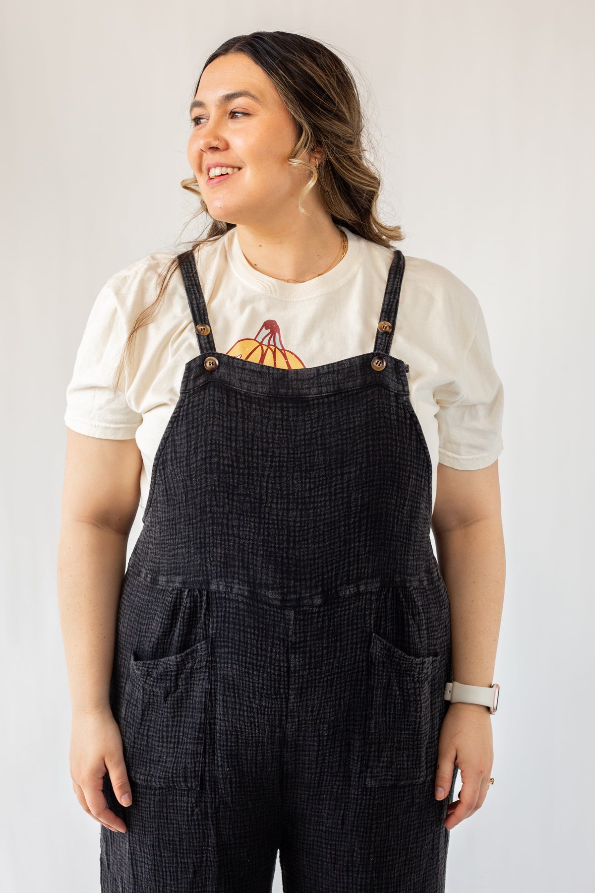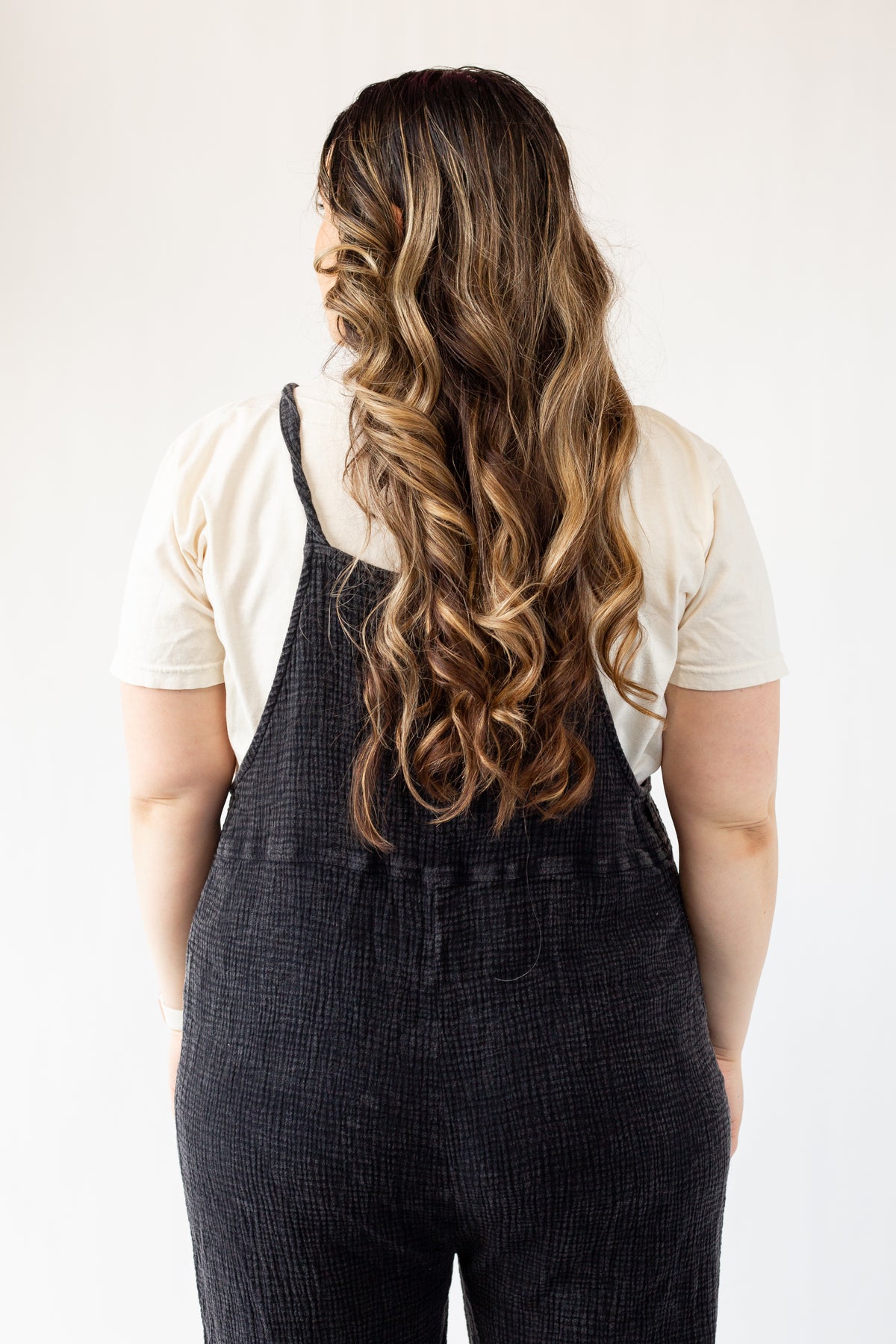 The new everyday overalls. Soft gauze material will have you wanting to never take it off. The button shoulder straps allow for versatile style and can even be breastfeeding friendly (we see you moms!). Please note that each wash style might have a slightly different wash effect and/or bleached spots. These spots are part of the washing process and it is not defective.