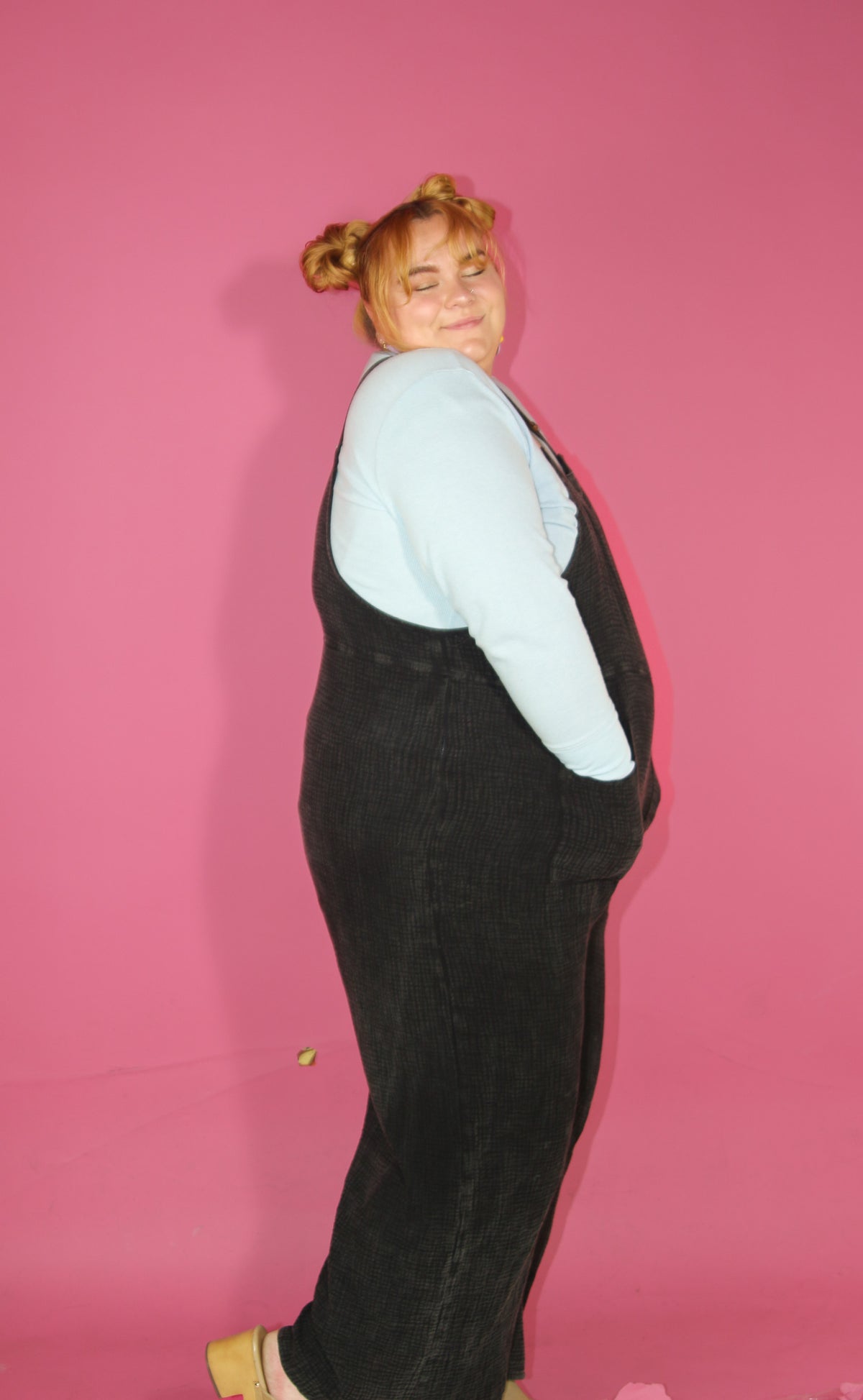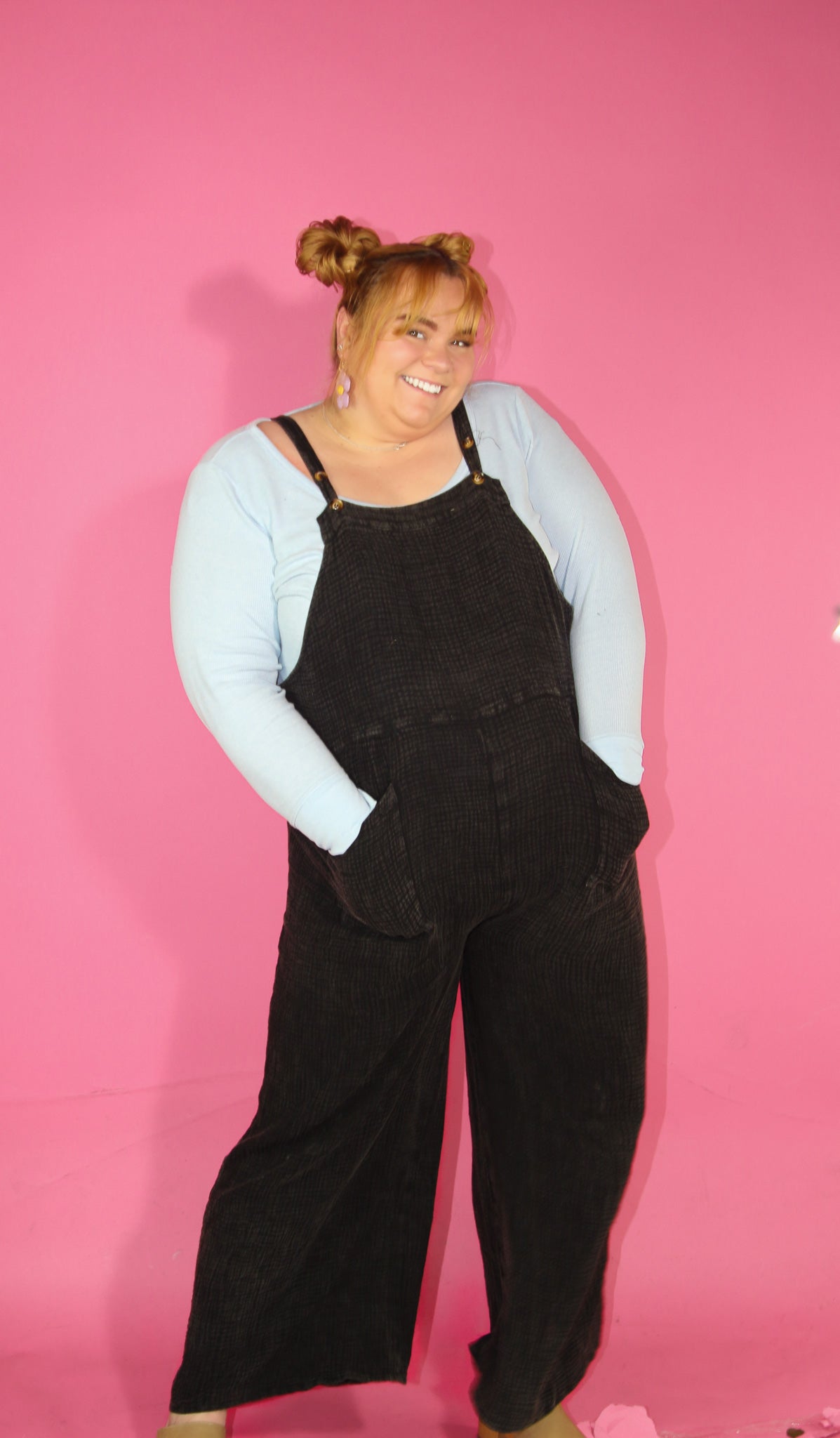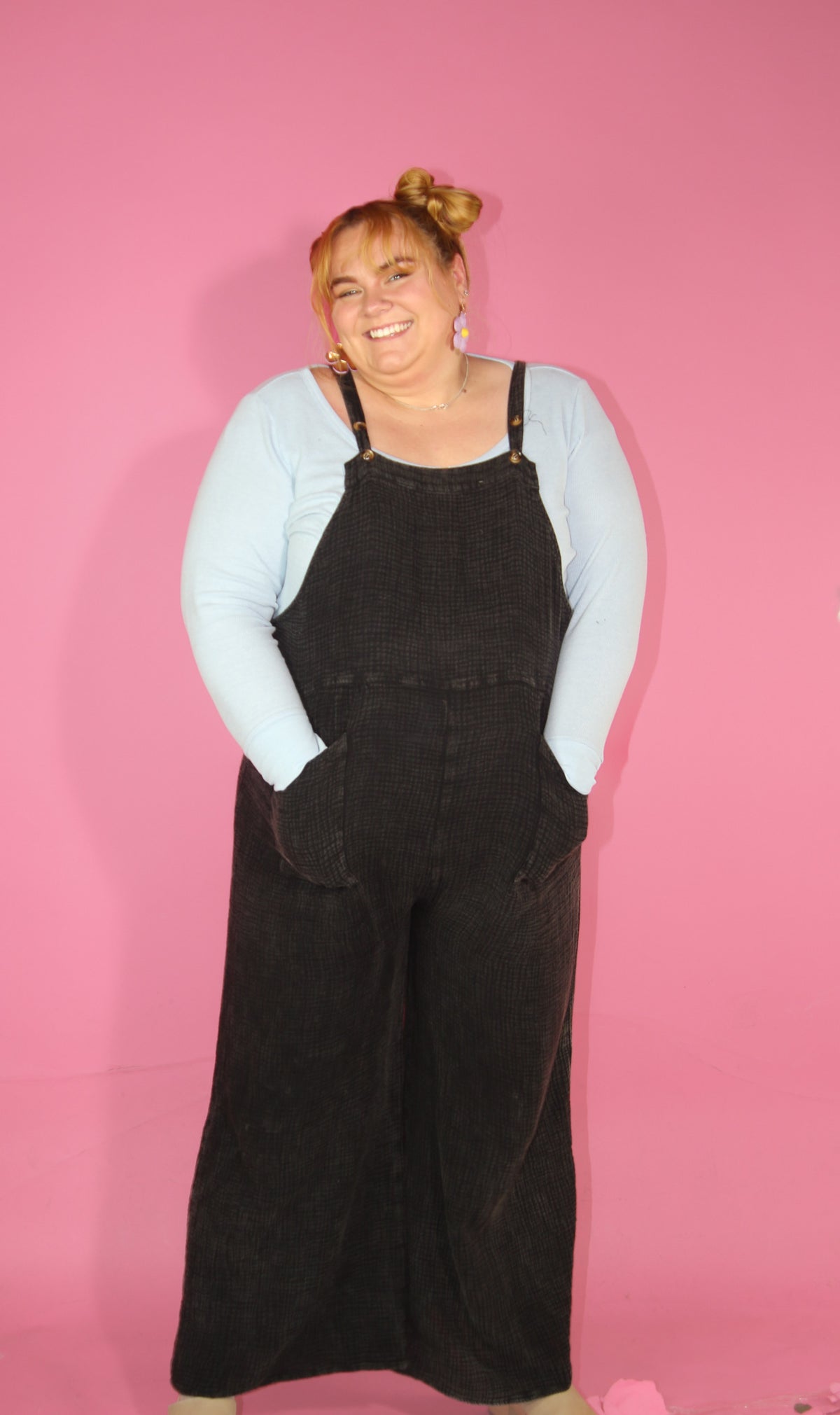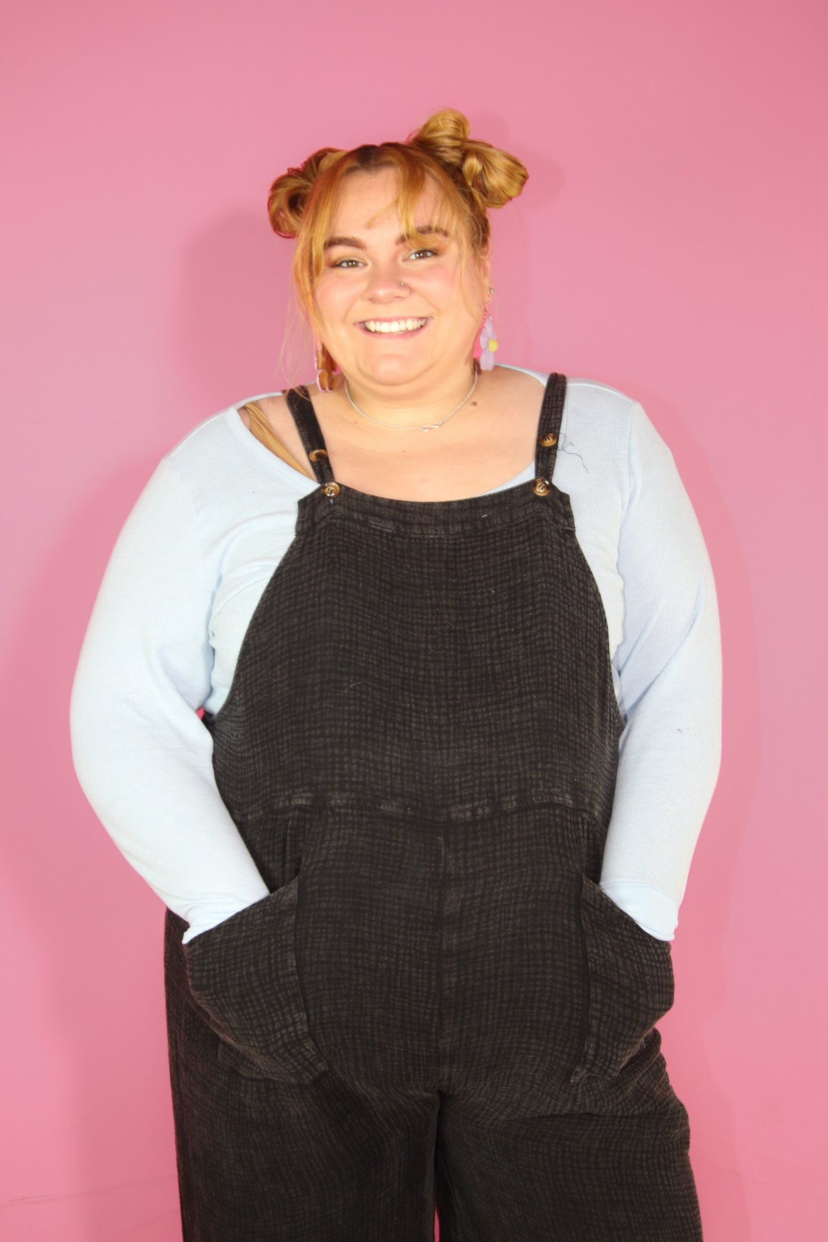 The new everyday overalls. Soft gauze material will have you wanting to never take it off. The button shoulder straps allow for versatile style and can even be breastfeeding friendly (we see you moms!). Please note that each wash style might have a slightly different wash effect and/or bleached spots. These spots are part of the washing process and it is not defective.