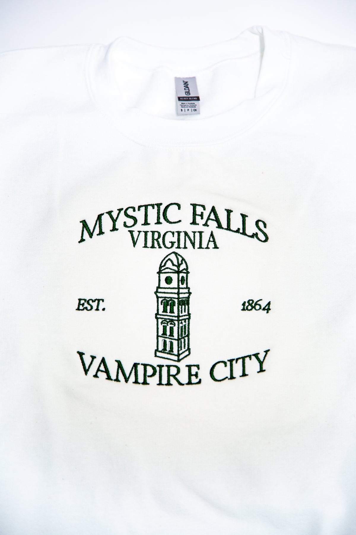 Mystic Falls Vampire City embroidered design on our comfiest crewneck sweater. Cozy enough for colder nights with the right amount of stretch. Featuring forest green embroidered lettering and the iconic Mystic Falls clock tower stitched out across the center chest. This item is made to order in our shop.
