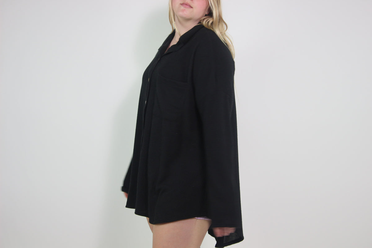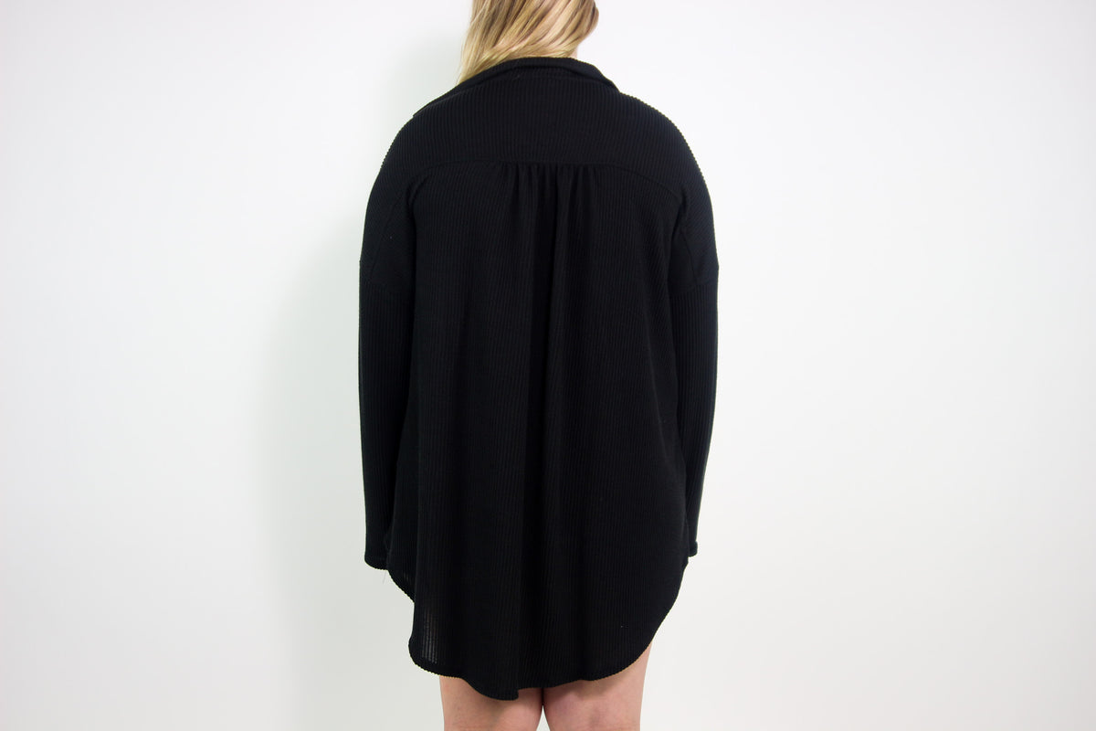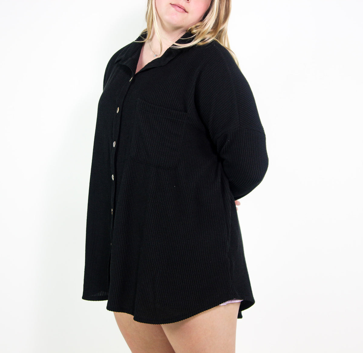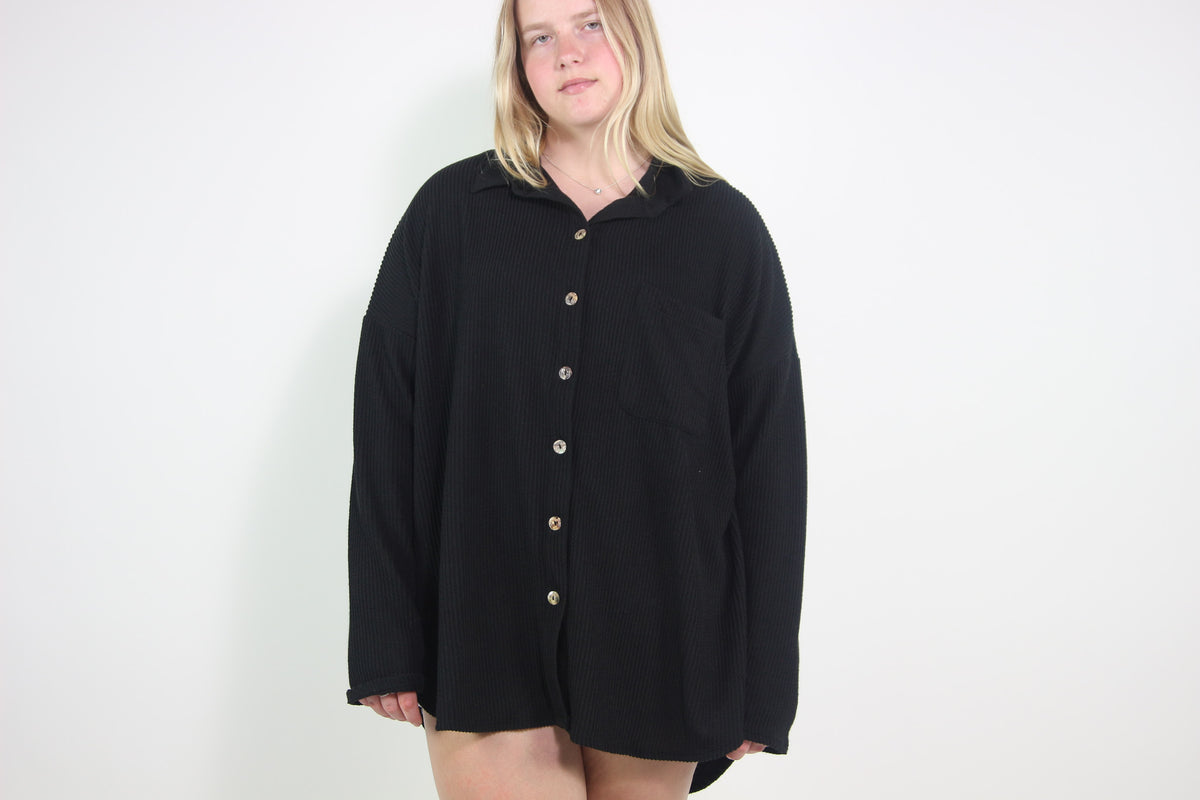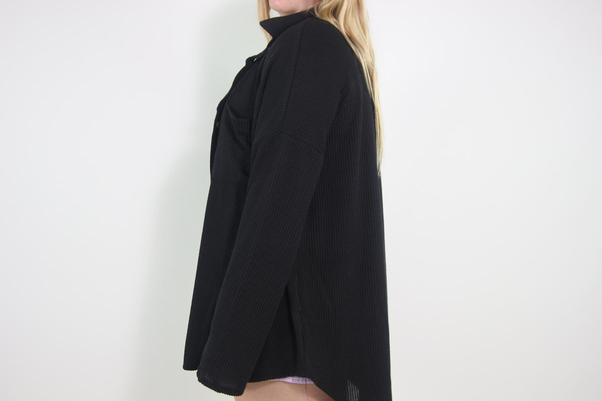 This ribbed oversized button up is perfect for both casual and dressier looks. Its soft and stretchy composition, made from a blend of polyester and rayon, allows for comfortable all-day wear. Available in either black or white, this versatile piece elevates your wardrobe. Wear it with the matching joggers for a sporty comfortable look or dress it up with jeans and jewelery for a night out.