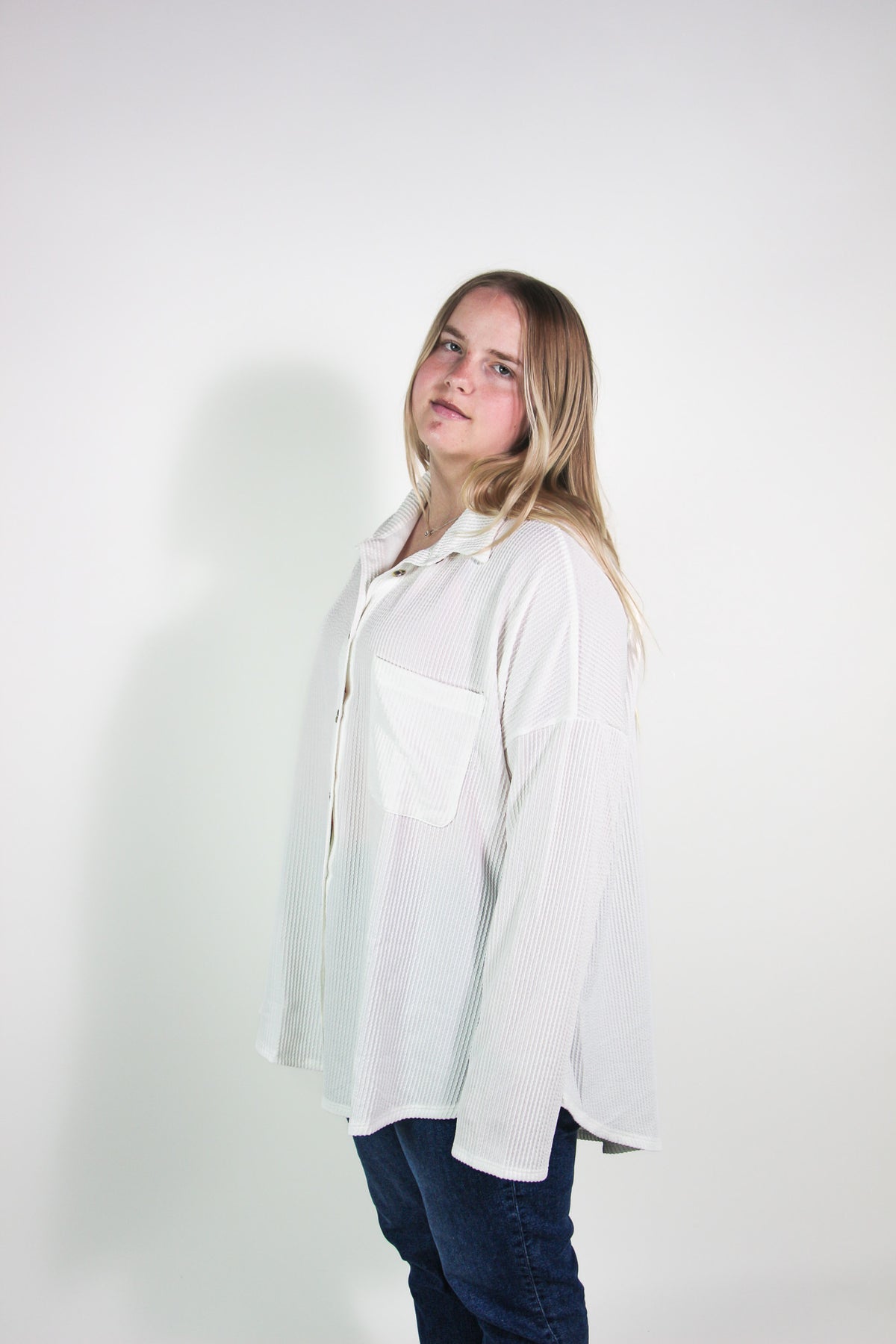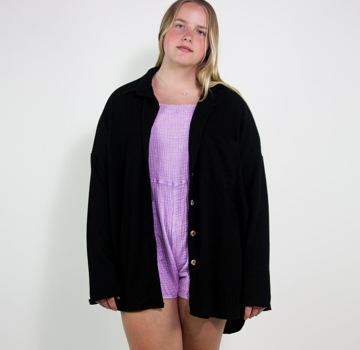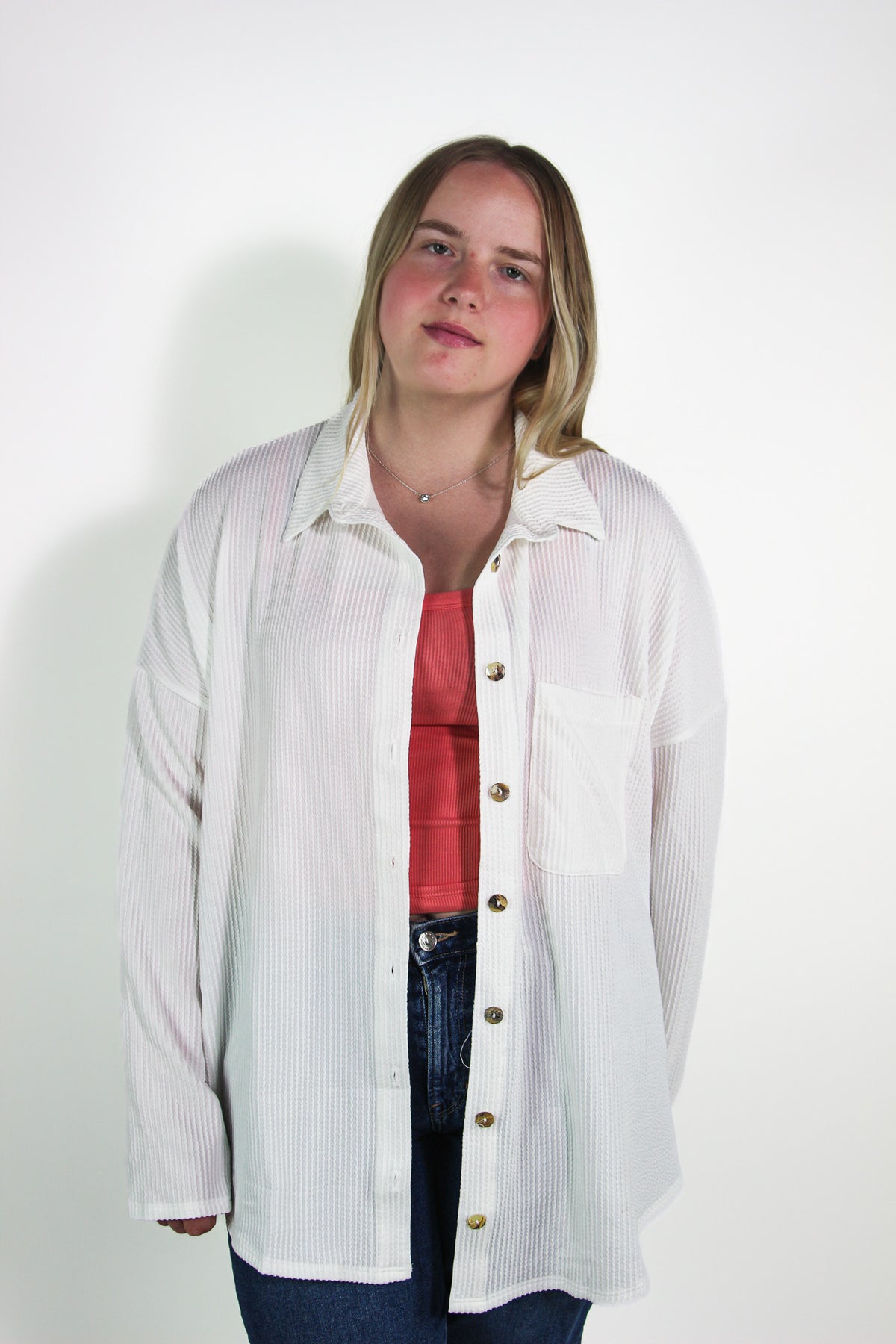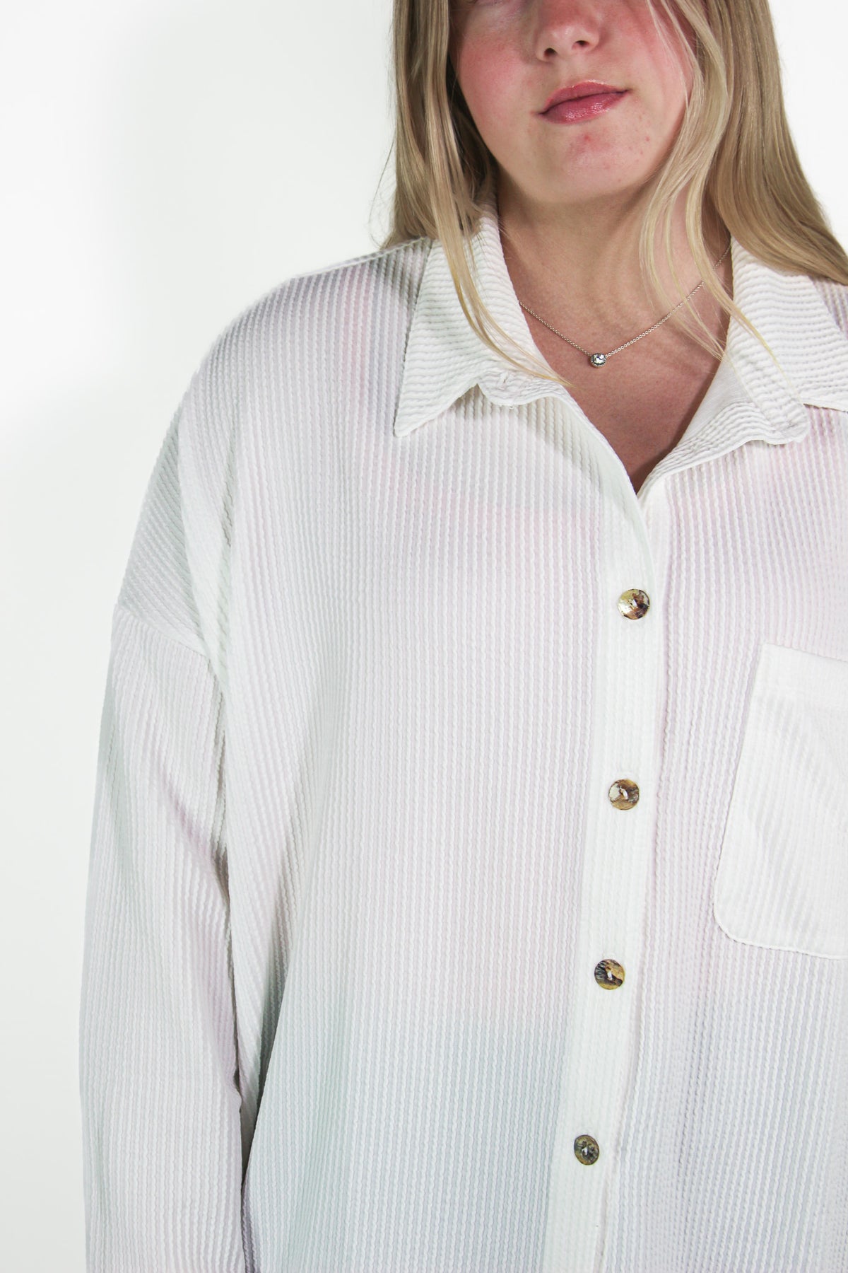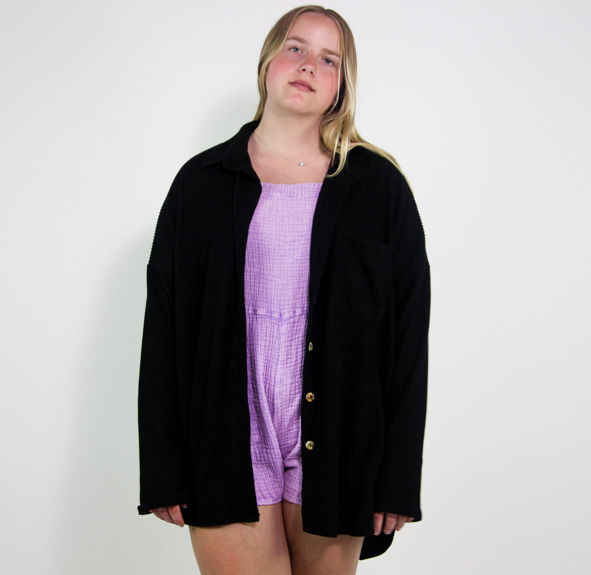 This ribbed oversized button up is perfect for both casual and dressier looks. Its soft and stretchy composition, made from a blend of polyester and rayon, allows for comfortable all-day wear. Available in either black or white, this versatile piece elevates your wardrobe. Wear it with the matching joggers for a sporty comfortable look or dress it up with jeans and jewelery for a night out.