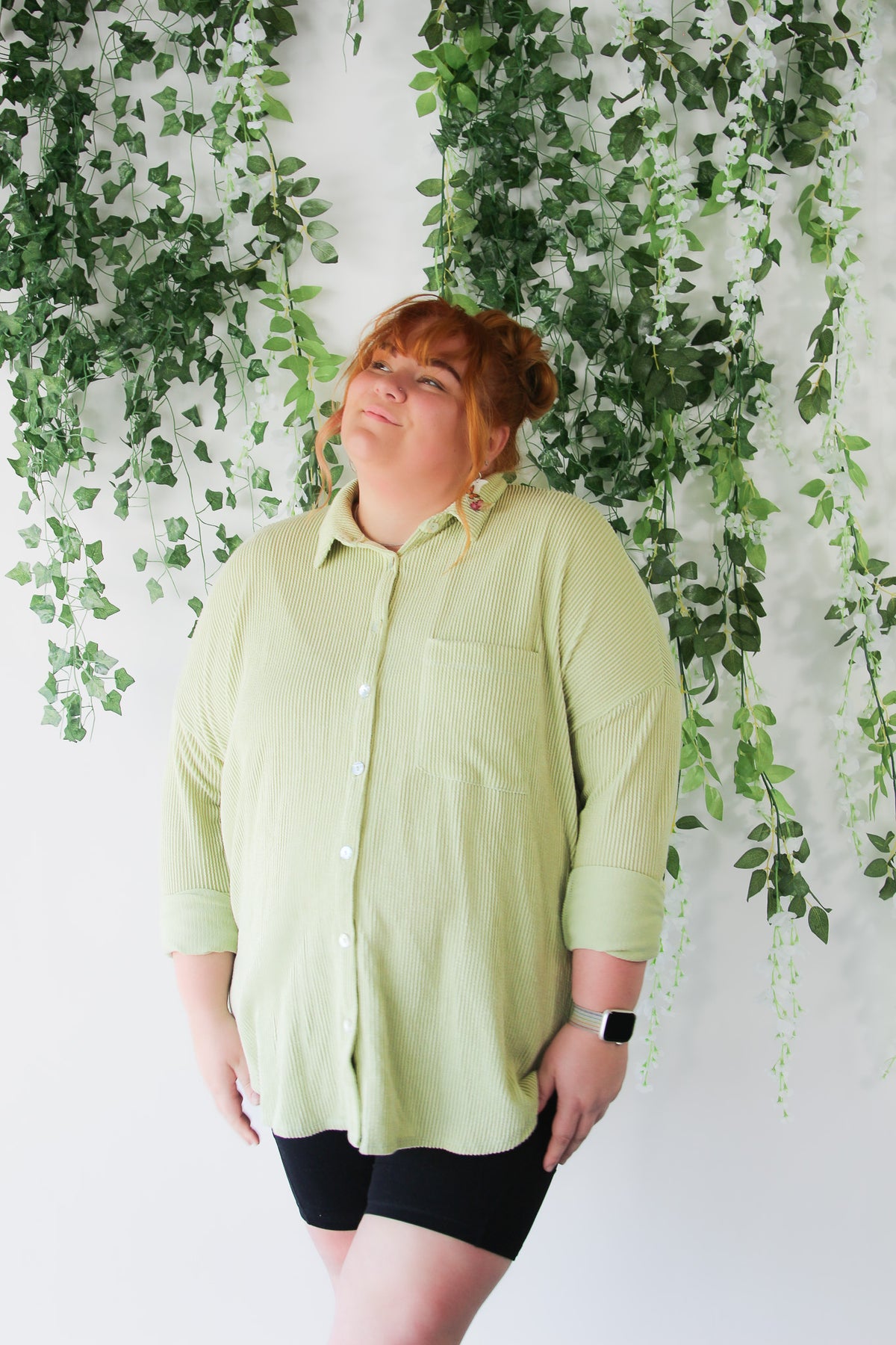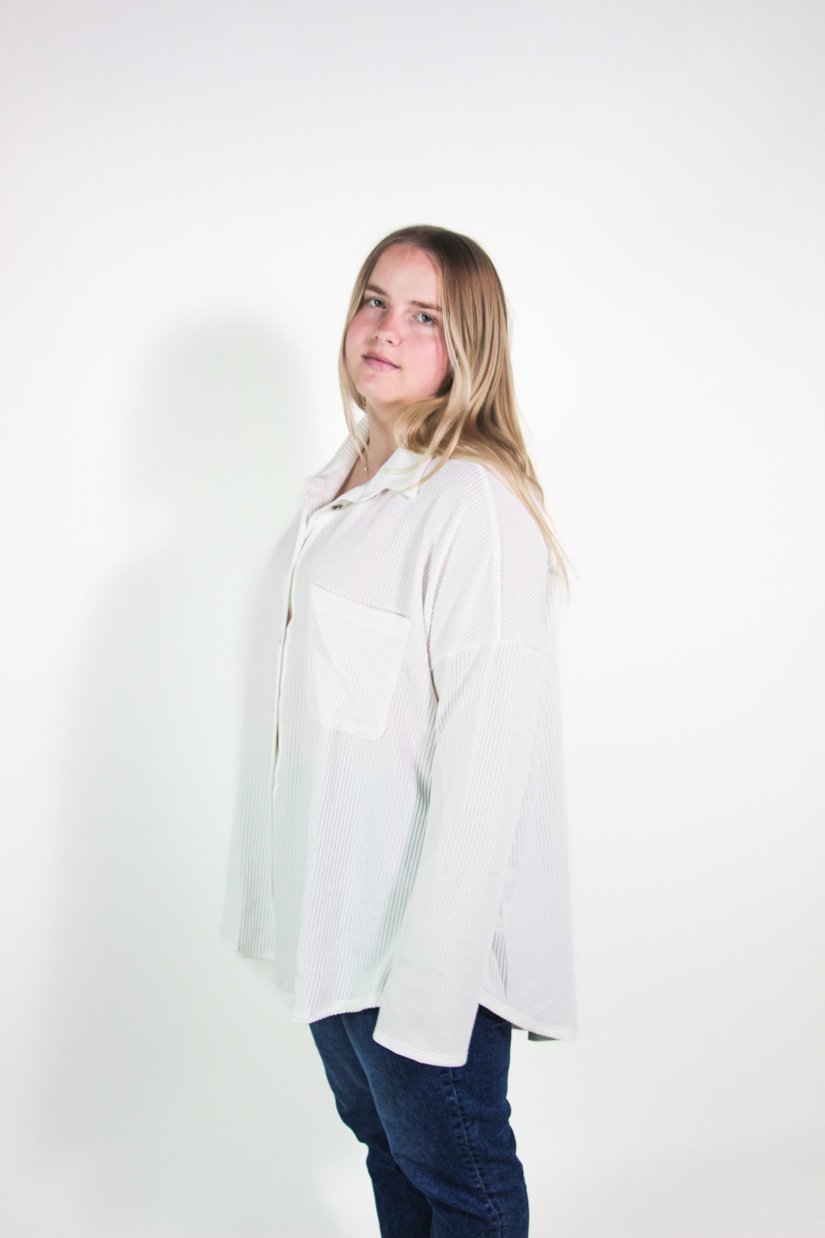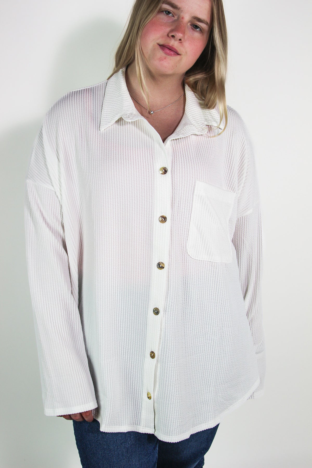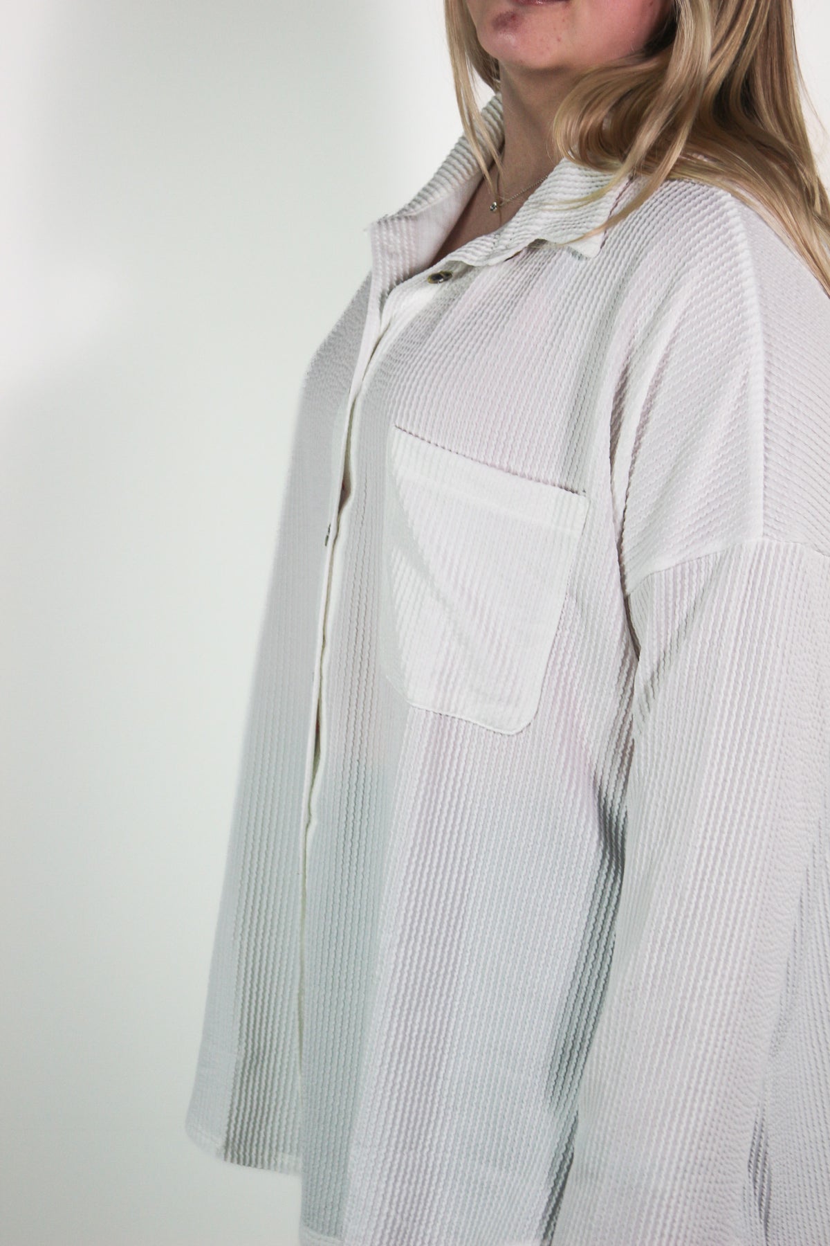 This ribbed oversized button up is perfect for both casual and dressier looks. Its soft and stretchy composition, made from a blend of polyester and rayon, allows for comfortable all-day wear. Available in either black or white, this versatile piece elevates your wardrobe. Wear it with the matching joggers for a sporty comfortable look or dress it up with jeans and jewelery for a night out.