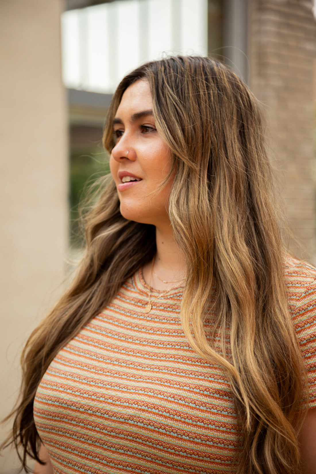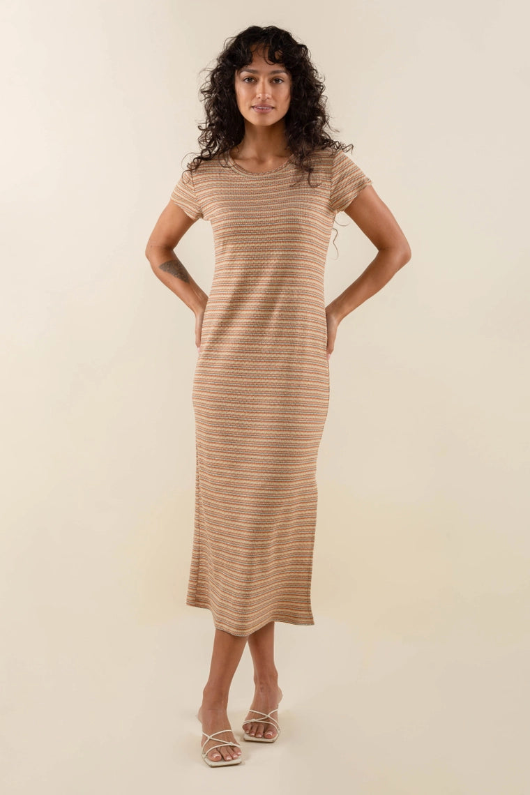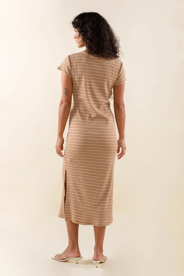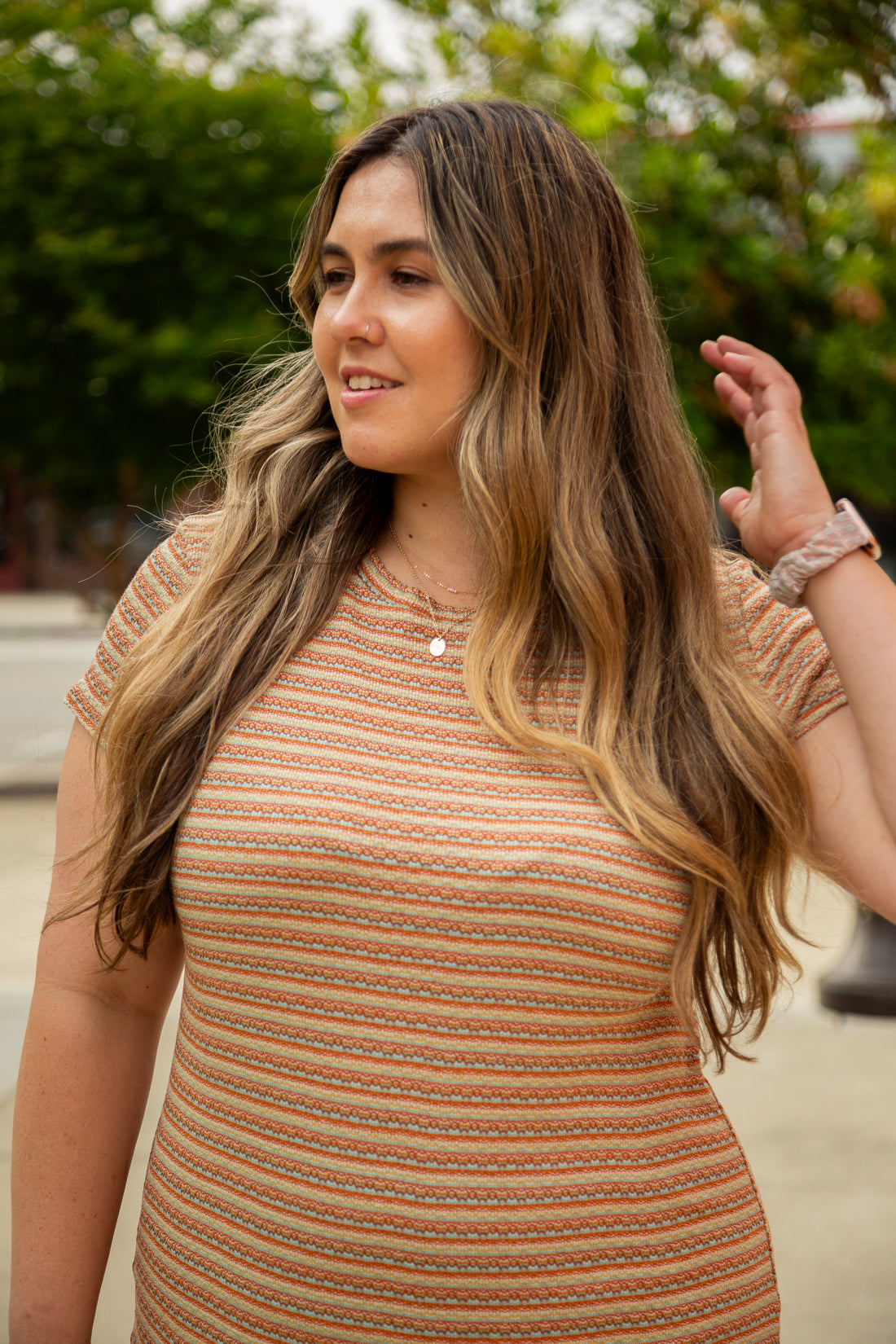 A bestseller here at the boutique, the Ava Short Sleeve Striped dress is a casual and comfortable stretchy dress with a small slide slit. The colorful, yet muted stripes give a vintage vibe with a modern silhouette. The side slit is the perfect length. Dress up with boots for an elevated vibe or just wear sandals for an easy everyday look. We recommended sizing down if you're in between sizes.