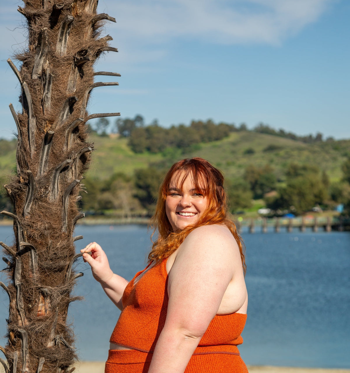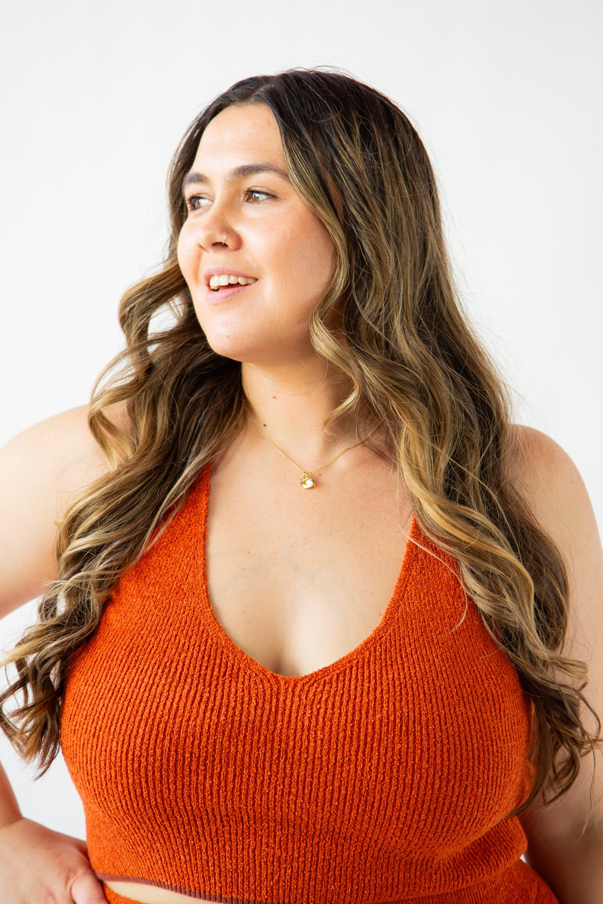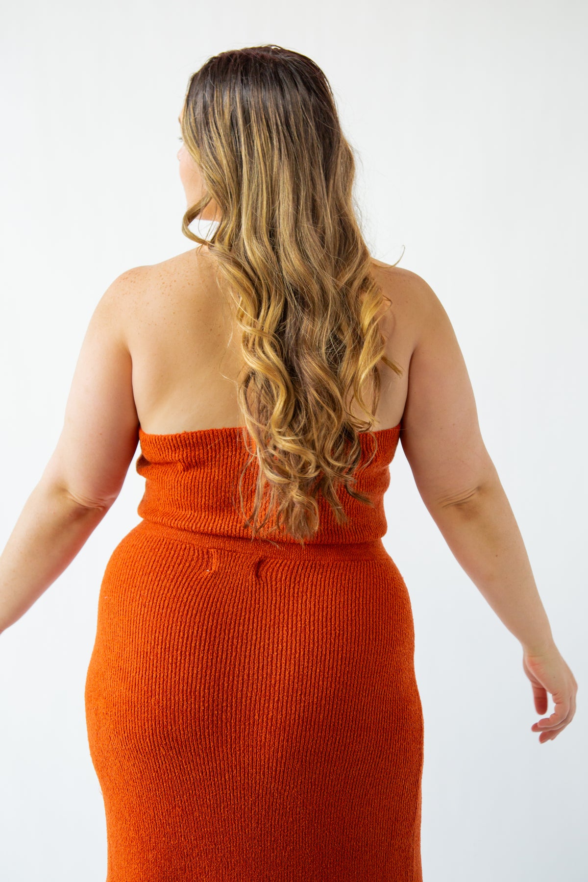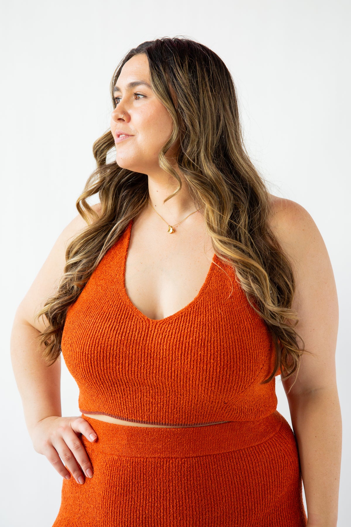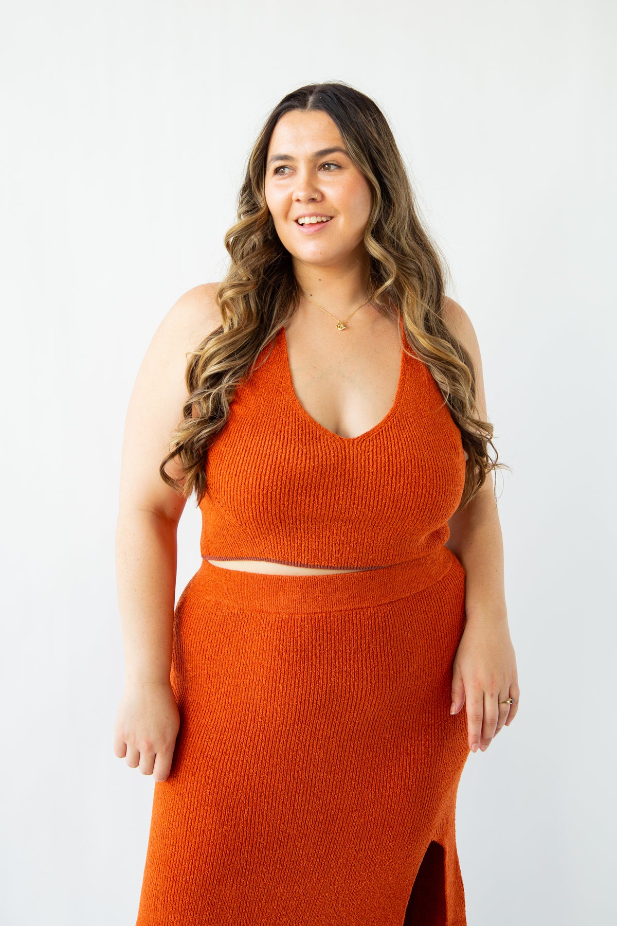 Indulge in pure comfort with the Til Dusk Knitted Racerback Top. This exquisite crop top features a racerback design with a delicately open back and charming eyelet details. The hem is beautifully lined with a rich rust color, adding a touch of whimsy. Wear it with the Til Dusk Knitted Skirt for a complete for the full look, or pair it with your favorite jeans for a chic and versatile outfit.