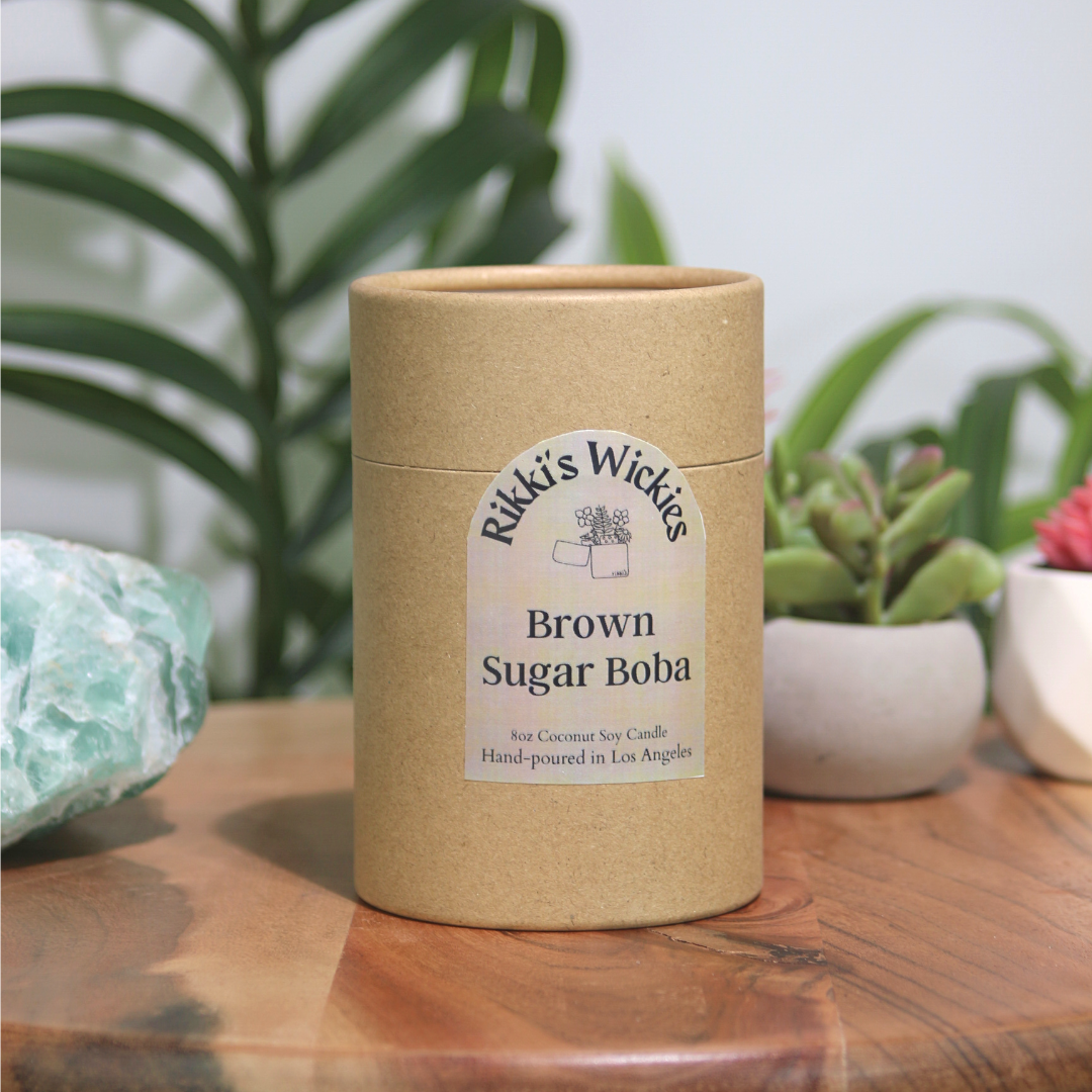 Introducing Rikki's Wickies Brown Sugar Boba scented hand poured candle, the perfect way to bring the sweet and creamy aroma of your favorite Boba Milk Tea drink into your home!