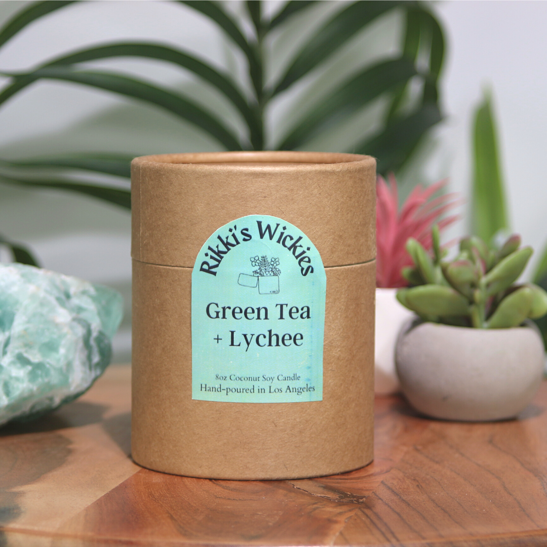 Introducing Rikki's Wickies  Green Tea & Lychee candle. Experience the invigorating and rejuvenating scent of green tea and lychee with this single wick coconut soy candle.