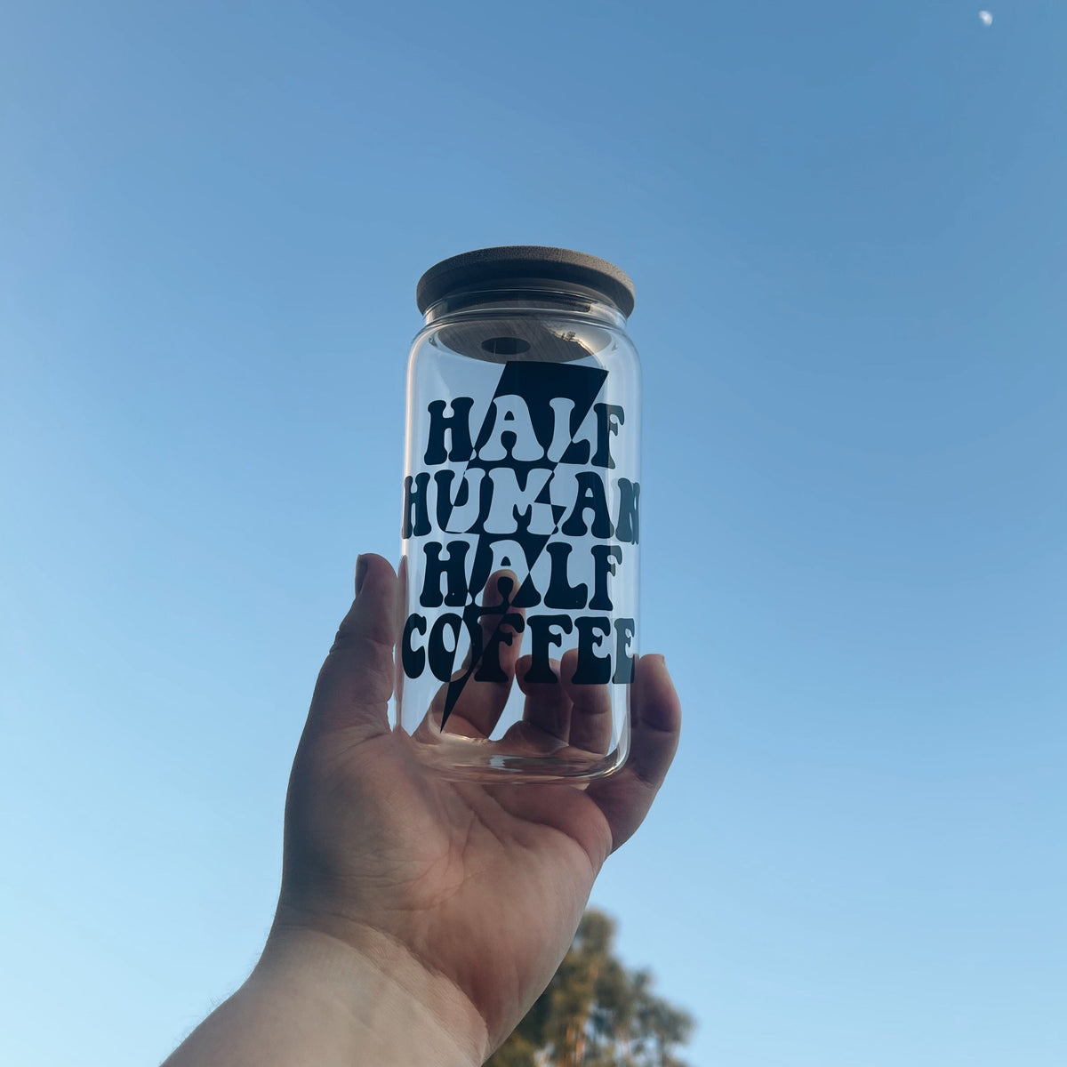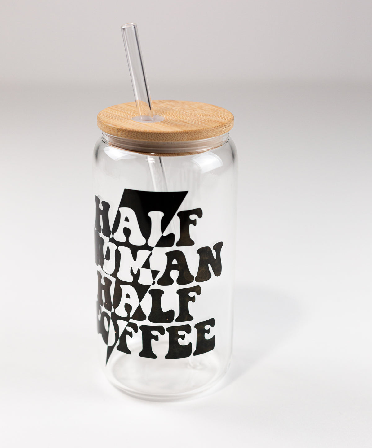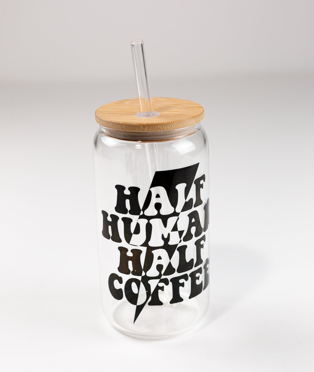 Who else is half human, half coffee? We know we are. Drink your favorite coffee beverage out of our 16oz glass can cup. It's made of sturdy, thick glass. The sublimated design allows for easy wash. It comes with a bamboo lid and plastic straw.