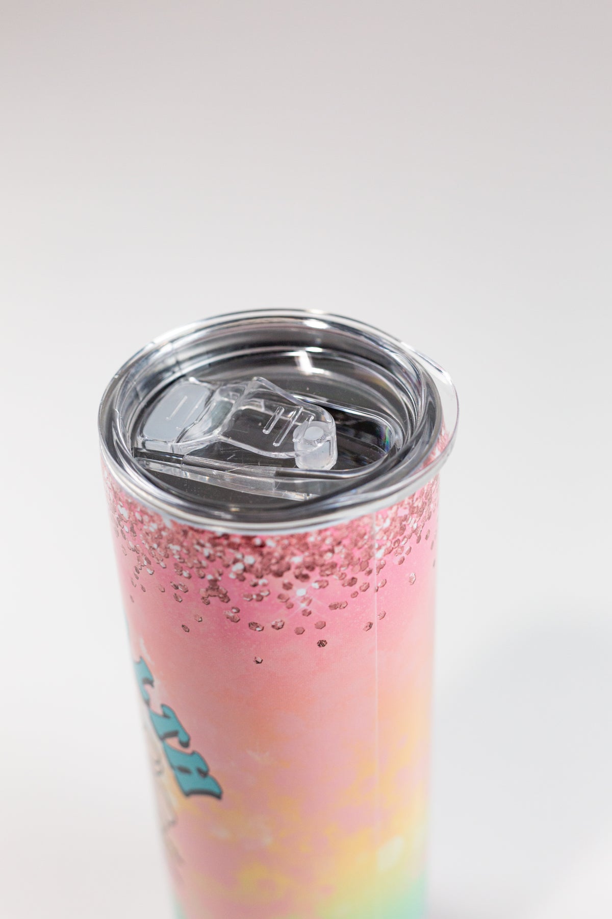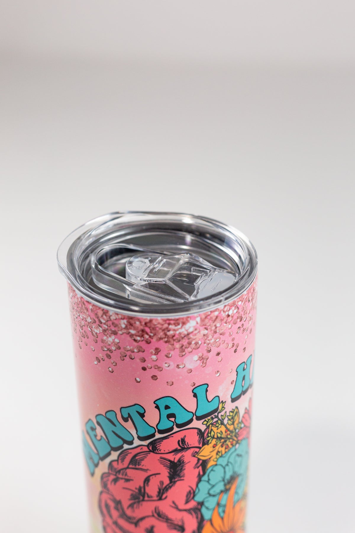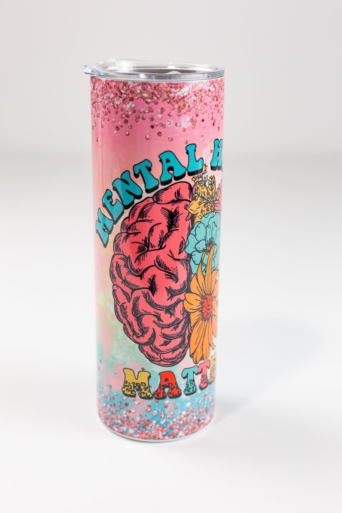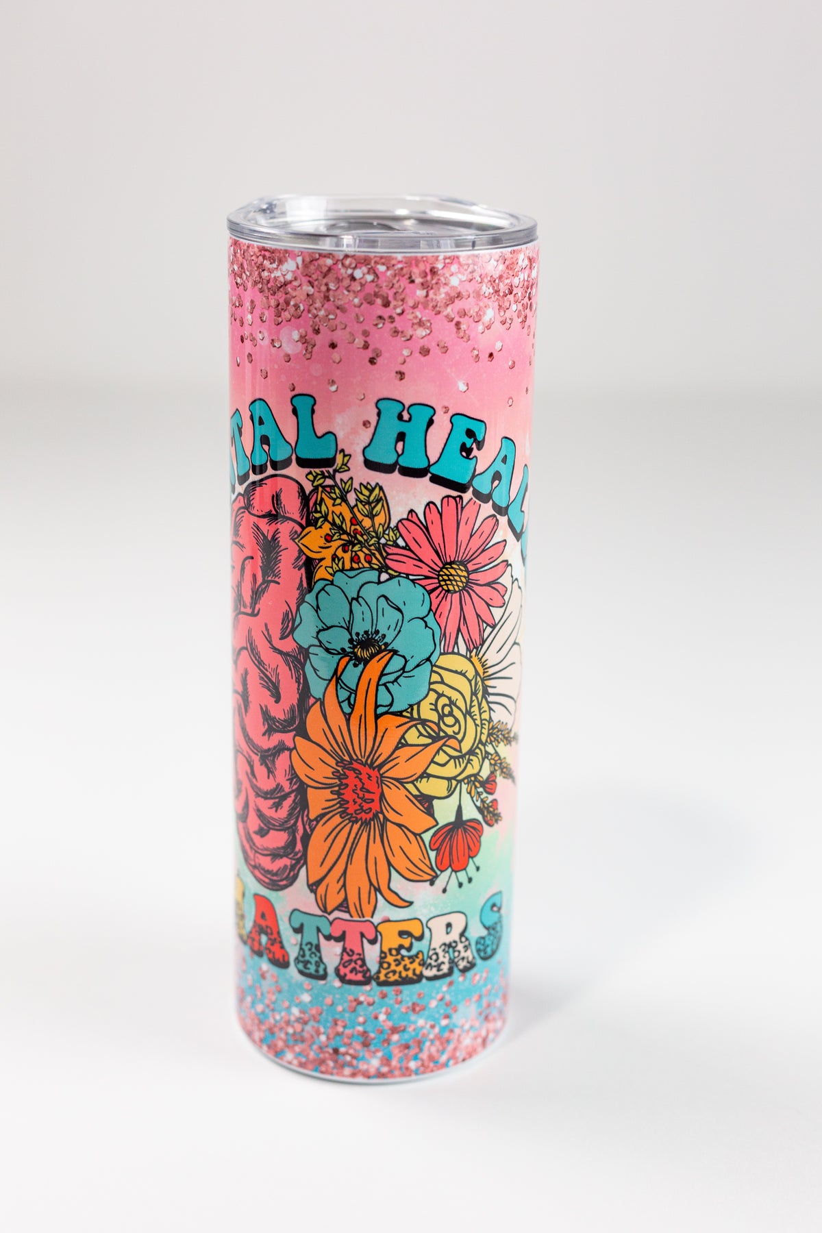 End the stigma with this Colorful Mental Health Matters Floral Tumbler. These insulated tumblers are the perfect addition to your daily beverage routine. This colorful tumbler features a brain with flowers design on a pinkish ombre background with glitter art coming out from the top. Our tumblers are stainless steel, double-walled and BPA free. Perfect for both hot and cold drinks. We create and print all of our designs at our shop.