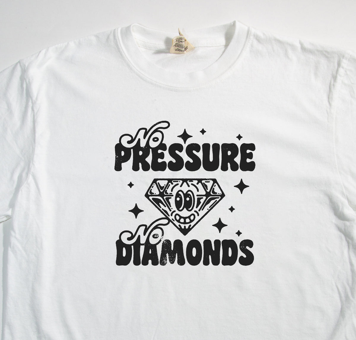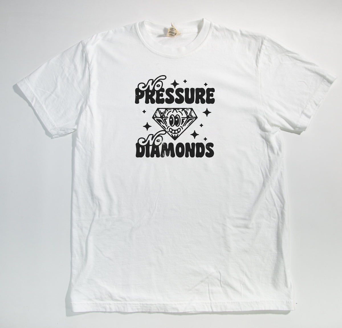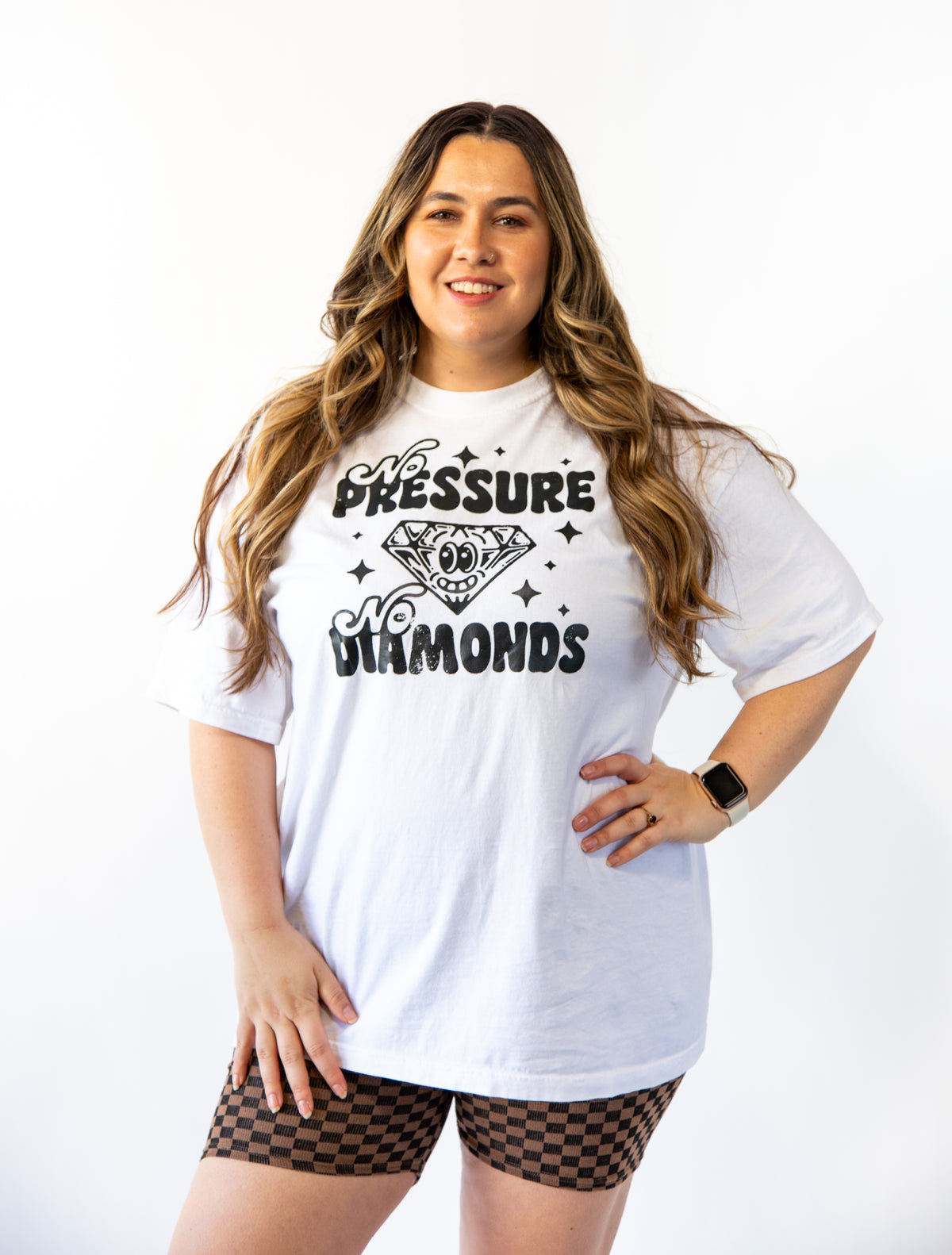 No Pressure, No Diamonds Graphic Tee. Our favorite soft 100% cotton ring spun tee is the perfect oversized and softness.  Our graphic tees are made to order as part of our slow fashion movement initiative. Then zooming to ya with Standard Shipping (3-5 business days).