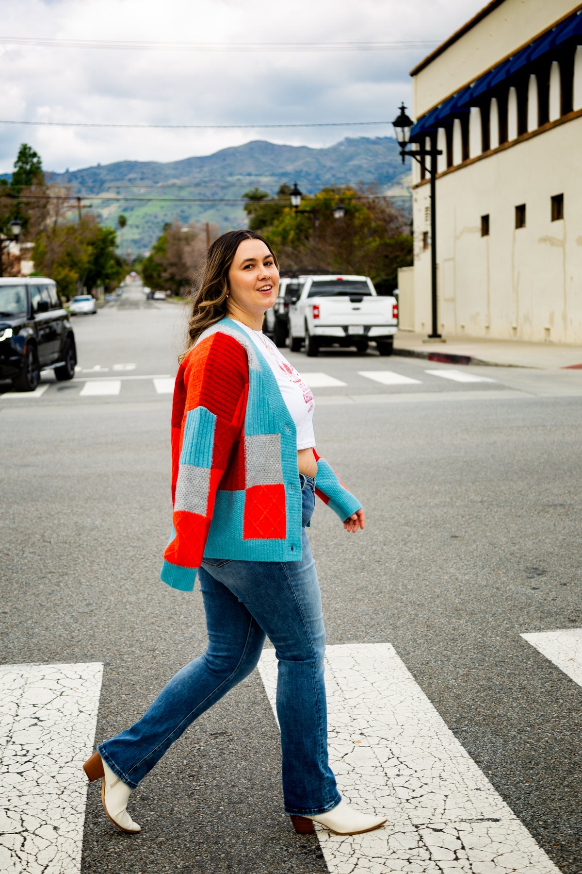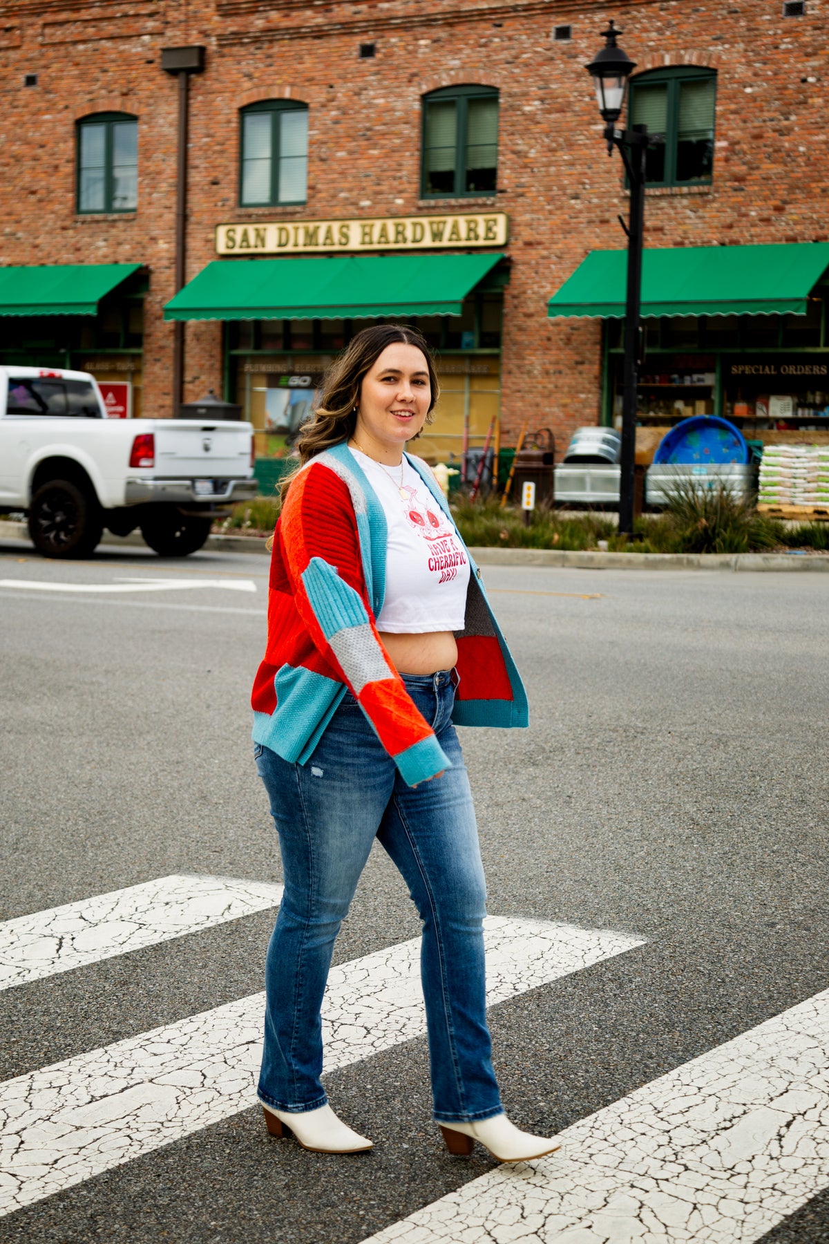 Tiff is typically a size 14/16 in jeans and XL in tops. She’s currently wearing a size 14W in this style.