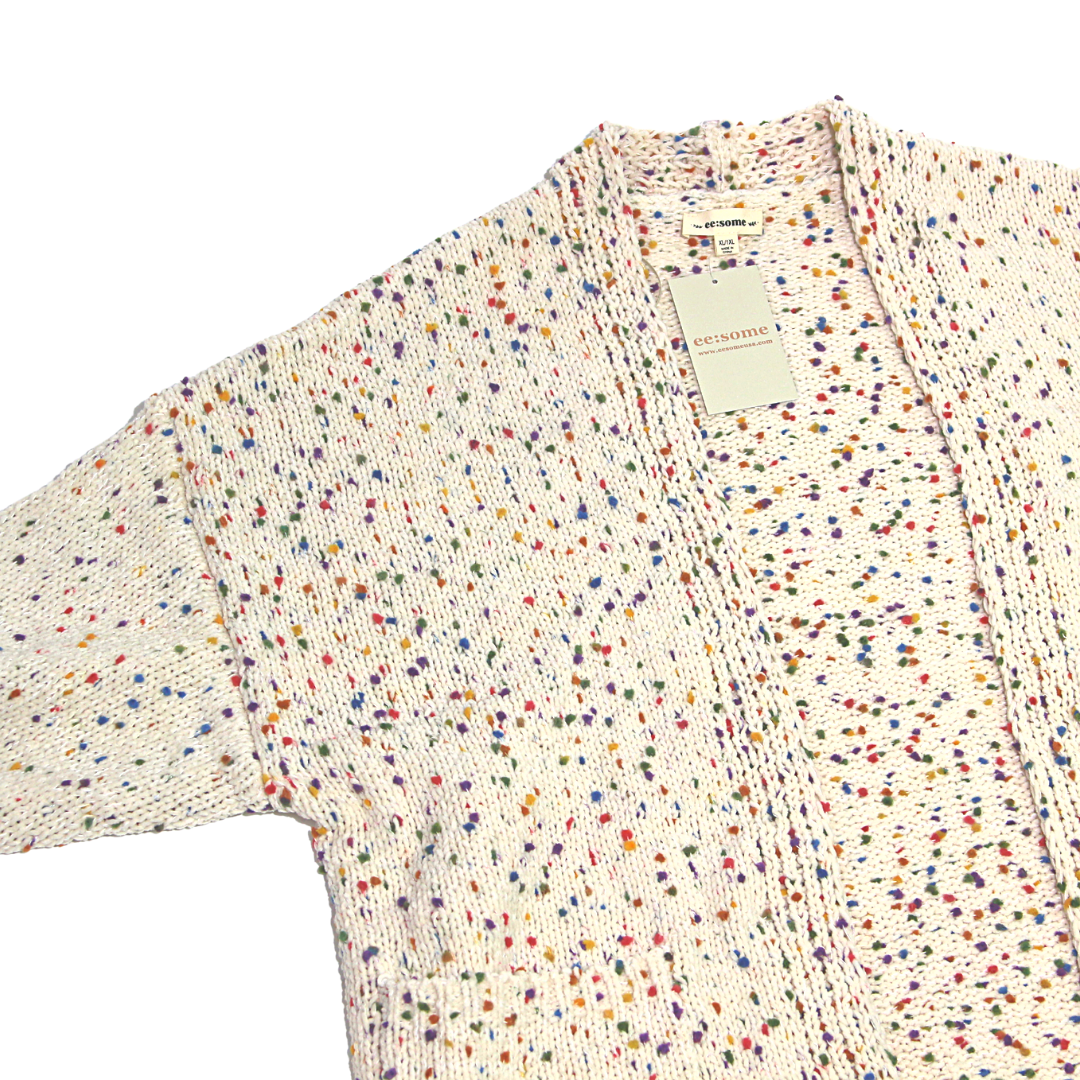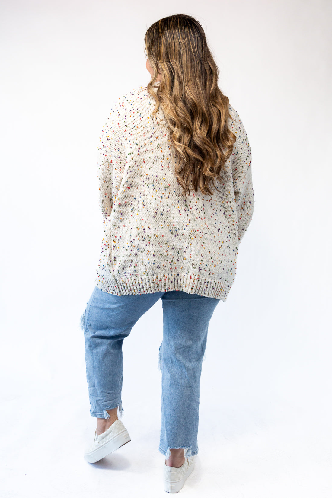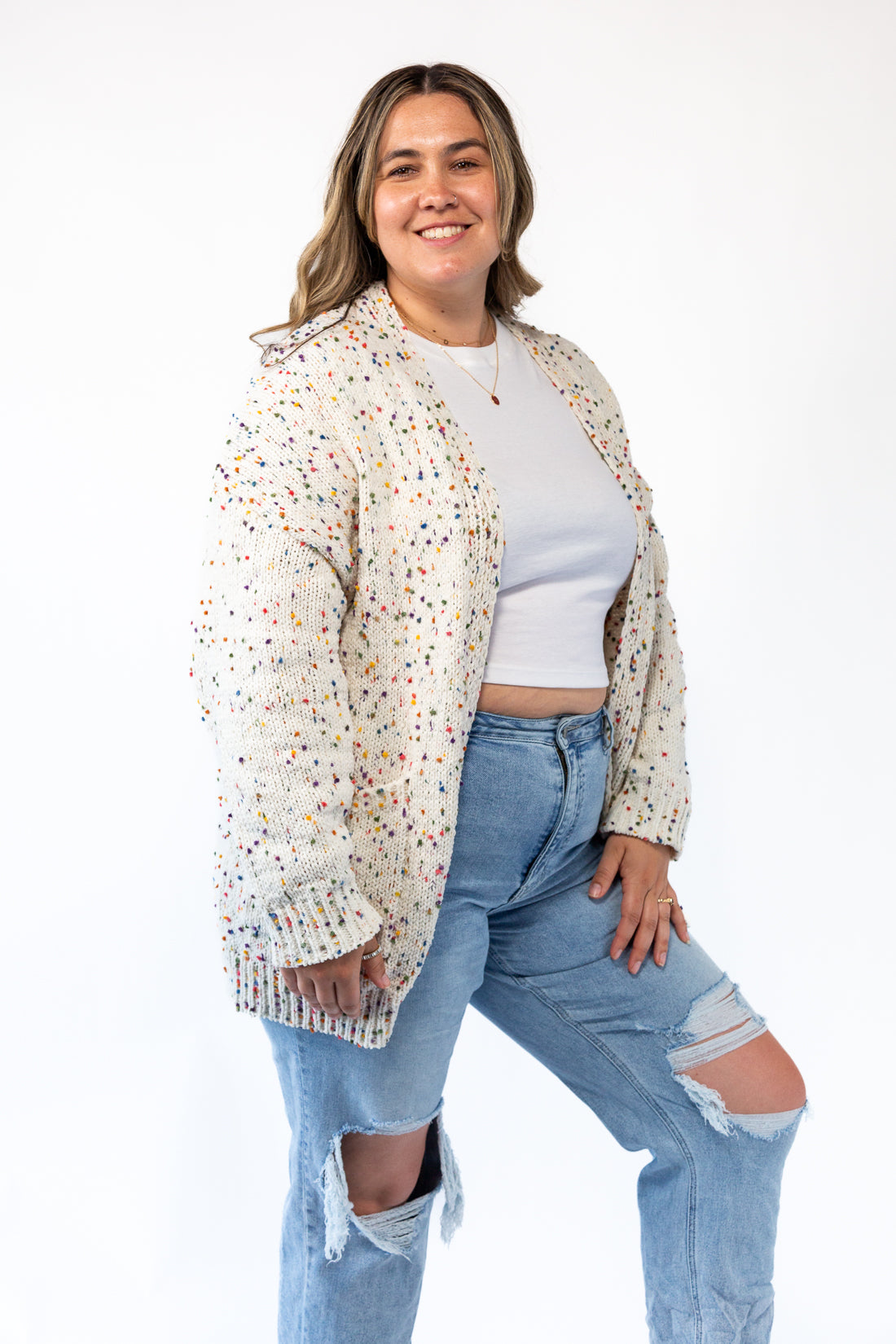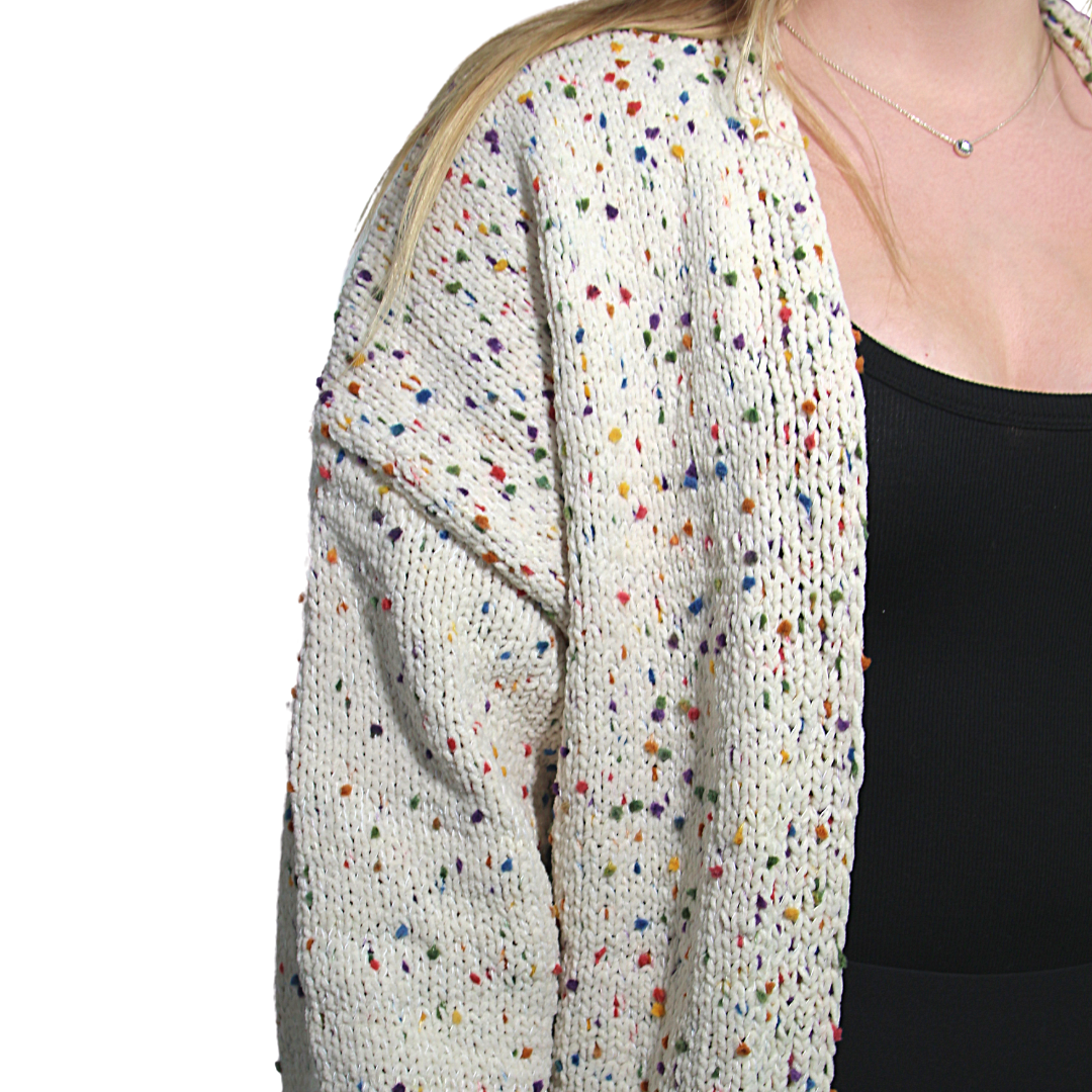 This Confetti Sprinkled Cardigan is the perfect combination of cozy and chic. Featuring super soft fabric with pops of color woven in, it's perfect for a trendy and easy look. Plus, it's slightly oversized for a comfortable fit. You'll want to curl up and enjoy your morning coffee or tea in this cardigan.