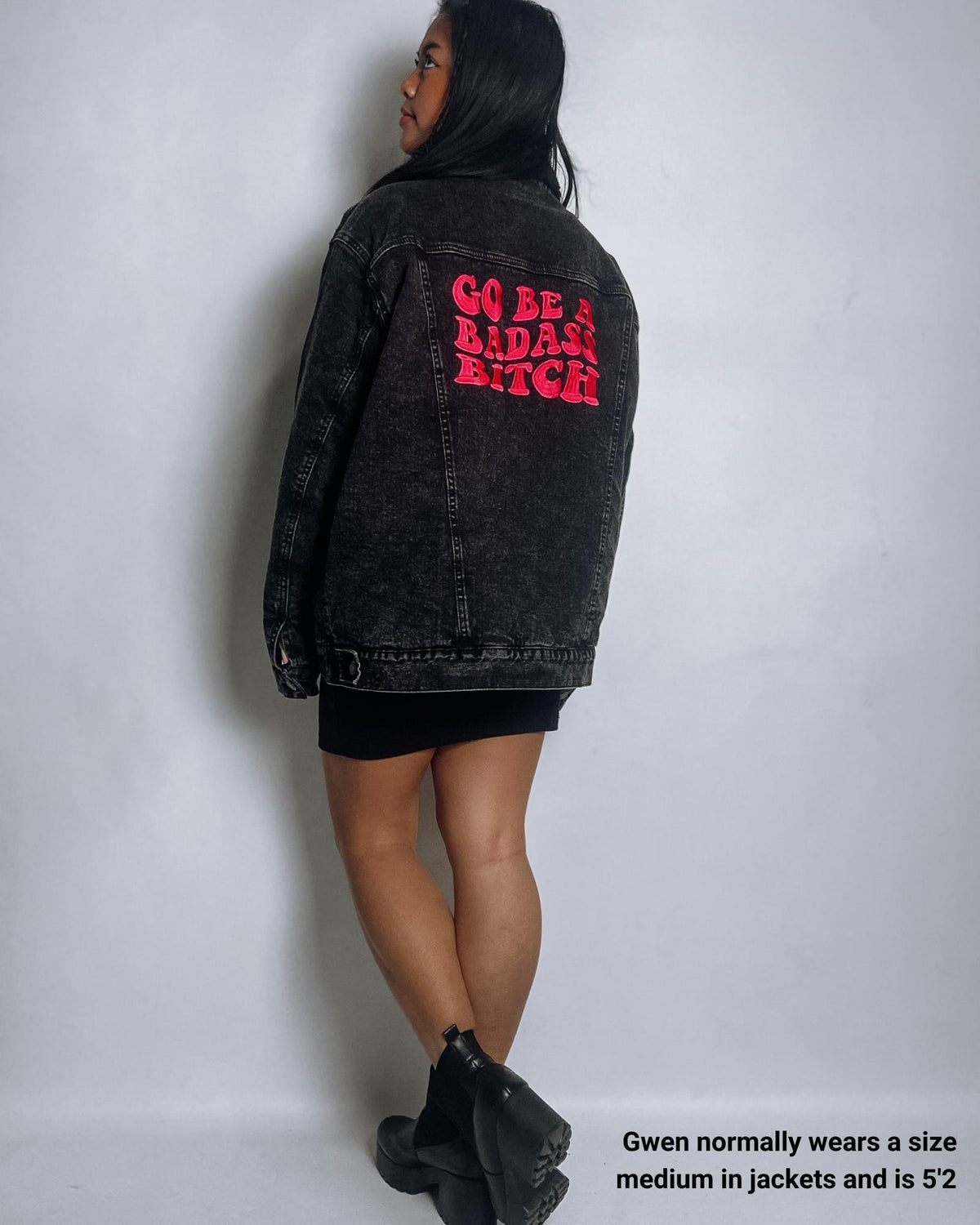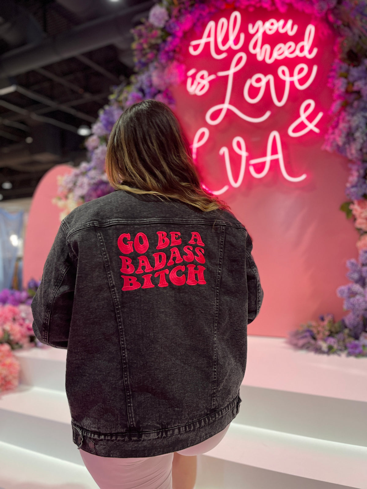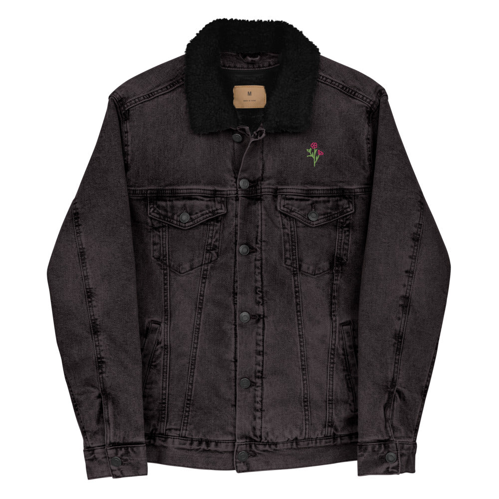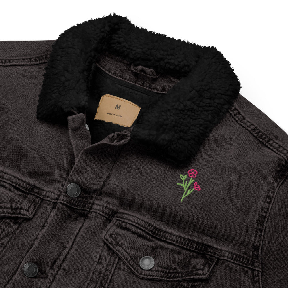 Take on the world with our "Go Be A Badass Bitch" mantra denim jacket, featuring our favorite mantra embroidered in hot pink on the back, and a small flower embroidered on the front. This jacket is lined with wool-like sherpa fabric that’s comfortable to wear and will keep you warm and snug. The sherpa lining is made of 100% recycled materials, including plastic bottles. The cotton is made from sustainably sourced cotton through the Better Cotton initiative.