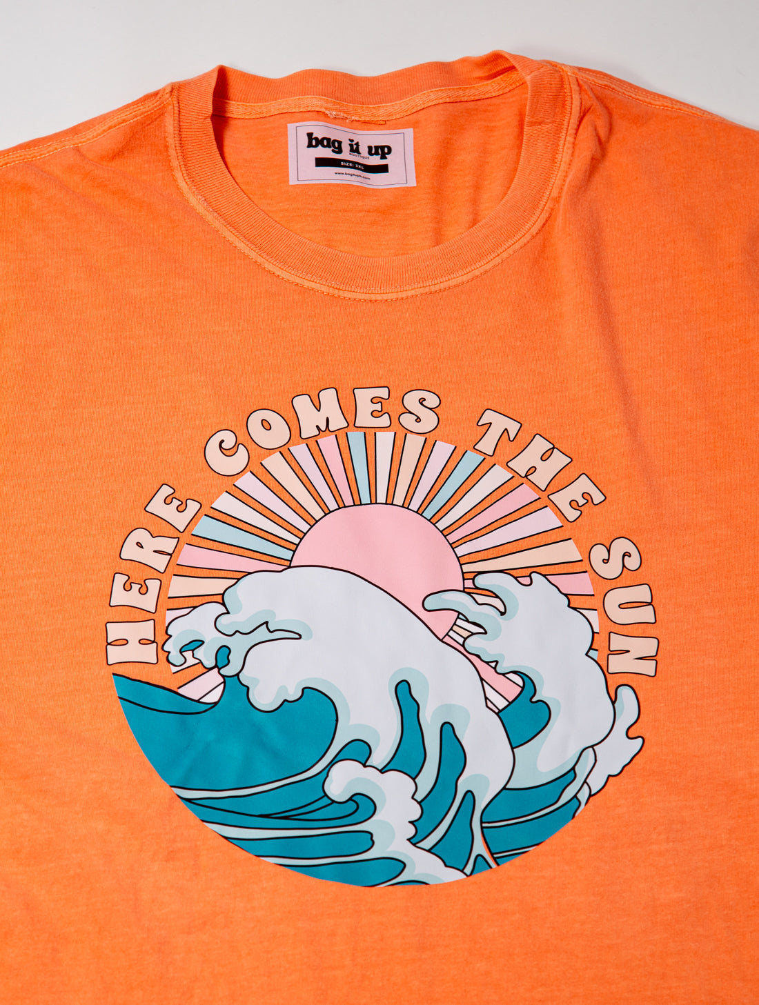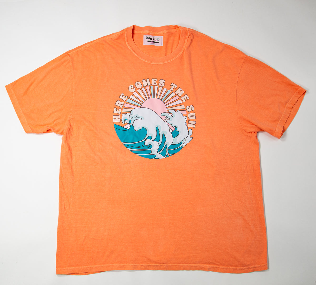 Bright and beautiful, Her Comes the Sun Oversized tee is made from 100% US Ring Spun cotton in a bright melon color. It's super soft with some stretched and just the right amount of oversized. This design is retro and slightly distressed featuring groovy text and teal ocean waves.