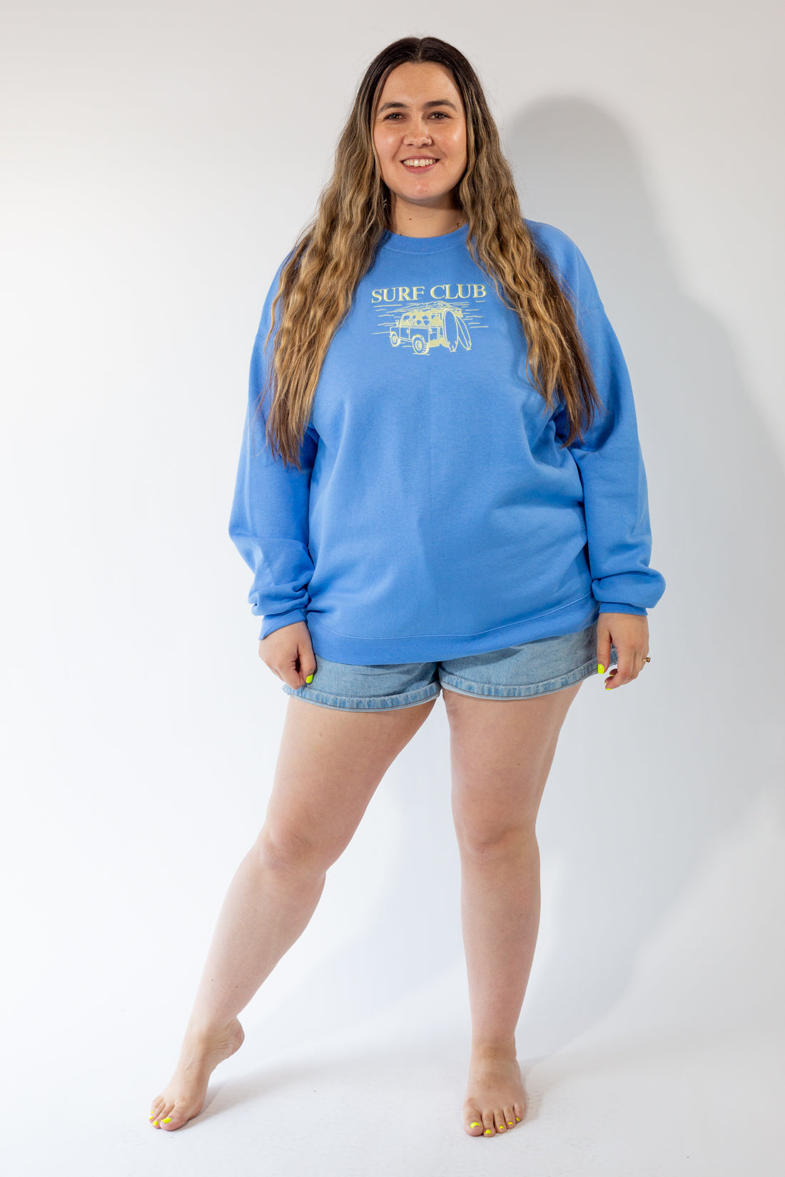 Join the club. Our Surf Club embroidered sweater is all summer vibes (even if you don't surf). This detailed embroidered periwinkle crewneck sweater featuring four a beautifully embroidered jeep with surfboards. This crewneck sweater has a slightly lighter exterior and runs a tad bit boxier and wider with stretch. For a fully loose oversized look, size up. This item is made to order in our shop so please allow up to one week processing time (we usually take less than that though).